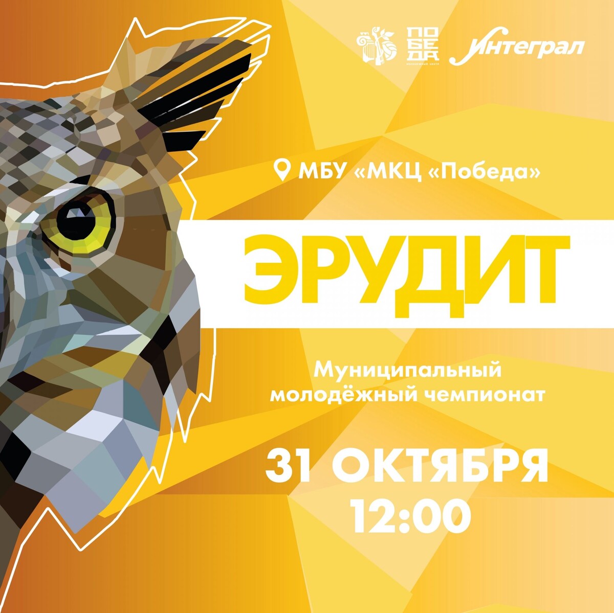 ✨ Внимание, интеллектуалы Домодедово❗️ Объявляется СУПЕР-турнир! 🏆 Молодёжный центр «Интеграл» объявляет о начале приёма заявок на участие в самом эпичном событии этой осени - Муниципальном молодёжном Чемпионате «Эрудит»! 🚀 Собери команду из 4-х гениев (14-18 лет) и приготовься к битве умов, которая определит сильнейших! ⚔️ 📌Условия участия просты: собери команду и отправь заявку до 24 октября на почту: integral.dmd@mail.ru ✉️ 🗓️ Дата и место решающей битвы: 31 октября в 12:00 в Молодёжном Центре «Победа» | Домодедово 📆 31.10.2025🕒12:00 🏢 Комитет по культуре, делам молодёжи и спорту 📍 Домодедово, Советская, 19 к1 ✅ Мероприятия Домодедово https://dzen.ru/id/66f10385cc4c5a16f7b5fb02 http://vk.com/domodedovo_events http://dzen.ru/domodedovo_events