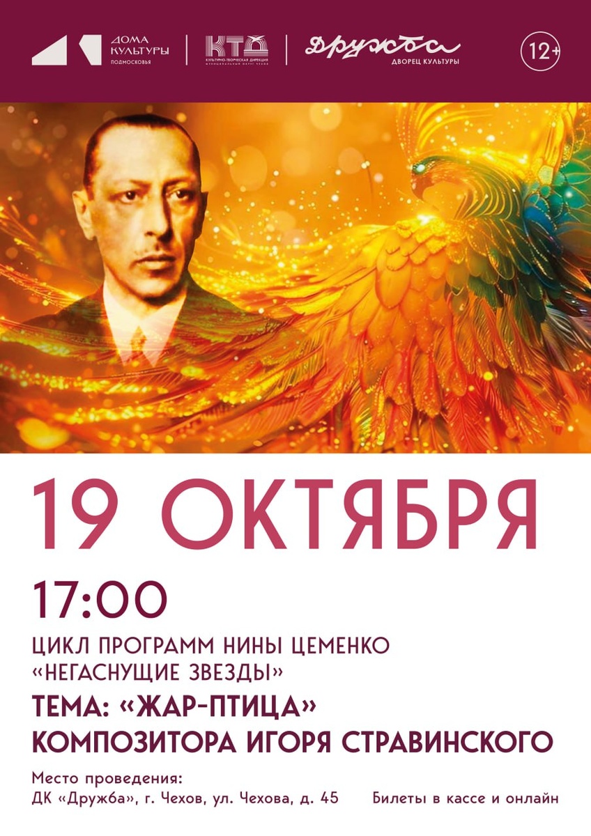✨ Авторская программа Нины Цеменко «Негаснущие звезды» 🔥Тема: судьба знаменитого русского композитора Игоря Стравинского. 🎫 БИЛЕТЫ в кассе 🚫 Возраст: 12+ 📆 19.10.2025 🕛 17:00 🏢 ДК «Дружба» 📍 г. Чехов, ул. Чехова, д.45 💰 Цена: 150 ₽ ⭐Поддержать канал голосом ✅ Мероприятия Чехов https://dzen.ru/id/66cc4b48e9ef144699238a51 http://vk.com/chekhov_events http://dzen.ru/chekhov_events