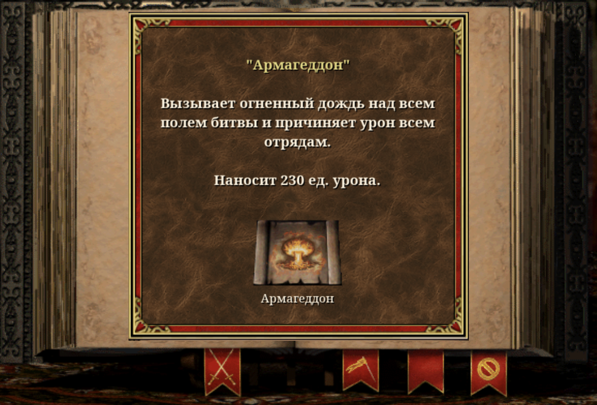 Да, боевое заклинание четвёртого круга Магии Огня под названием Армагеддон является самым разрушительным массовым заклинанием в игре... но применять вы его не будете. Ну ладно, безусловно, опытные игроки знают про разные тактики и возможности сделать так, чтобы общий урон, который огненным вихрем пройдётся по всему полю боя, не затронул ваши войска. Прежде всего, спасти вас может отряд из драконов (золотых и чёрных). Такая тактика называется «Драгогеддон»: нападаем, применяем Армагеддон, слышим мелодию песни группы Aerosmith и гордо выходим победителями, пока на заднем фоне падают гигантские метеориты. Хотя в этом плане удобнее всего героям фракции Сопряжение — им не нужны драконы, так как в их рядах аж четыре типа существ из семи имеют иммунитет к Армагеддону. Теоретически, даже с простыми огненными элементалями маги Сопряжения могут армагеддонить, вопрос стоит только в том, где достать данное заклинание? В родном замке оно запрещено. В этих замечательных тактиках, надёжных как швейца