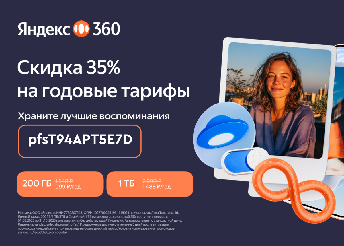 Безлимитное хранилище для фото/видео. А еще 👇🏻 К ним будет доступ у всей семьи! С любого устройства. Станет намного проще делиться фотографиями важных моментов, документами, видео. Ничего не потеряется, не удалится, не будет долго висеть в загрузке и забивать копиями память телефона. И это все – ваш верный помощник Яндекс 360 https://yandex360ru.prfl.me/promiki2023/cdiisb?erid=2VtzqvmDz1L Раз попробуете – и уже не будете представлять, как без него раньше обходились. В нем все – от красивой почты без рекламы и идеально организованных папок с личными и рабочимидокументами до гигабайтов семейного архива 🔥 Ваши снимки и ролики будут автоматом загружаться с телефона в безлимитное хранилище. Пробуем, пока акция: по промокоду pfsT94APT5E7D – скидка 35% на Личный тариф 200 ГБ/1 ТБ/3 ТБ и Семейный 1 ТБ в период с 01.08.2025 по 31.10.2025. Бонус для всех, у кого нет активной подписки. Автопродление – по стандартной цене. Реклама ООО "Яндекс", ИНН 7736207543