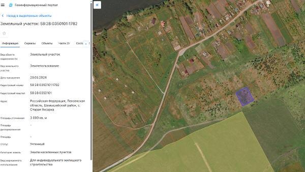 Название: Земельный участок из земель населенных пунктов с кадастровым номером 58:28:0350101:1782, общей площадью 3000 кв.м., с видом