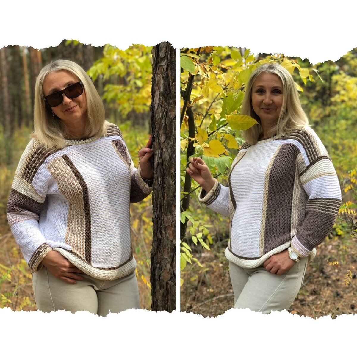 Любите ли вы платочную вязку? Ответ обычно 50/50! Многие считают ее примитивной, неудобной, не заслуживающей внимания. Платочная вязка - это первое, чему мы учимся, когда начинаем вязать. Может быть поэтому ее считают слишком простецкой? Не знаю. Я платочку люблю! У нее много возможностей! Очень много! Нужно просто попробовать! Сколько вариантов может быть у такого джемпера, связанного платочной вязкой? Оооочень много! Варианты расположения цветных полосок могут быть самыми различными. Я связала два разных. И цвет разный, и длина рукава, и длина самого джемпера. Не присваиваю себе идею, вдохновило фото из старого журнала. Все уже связано в этом мире. Мы лишь пропускаем через себя множество различных идей, получая на выходе нечто новое. Вот так и у меня получилось. Подобный джемпер можно связать из разной пряжи. Мои связаны из 100% хлопка. Хлопок не тонкий, 120м/50гр. Вариант ближе демисезонный, или не жаркое лето. Можно взять шерсть/полушерсть и т.д. Будет джемпер для холодной погоды.