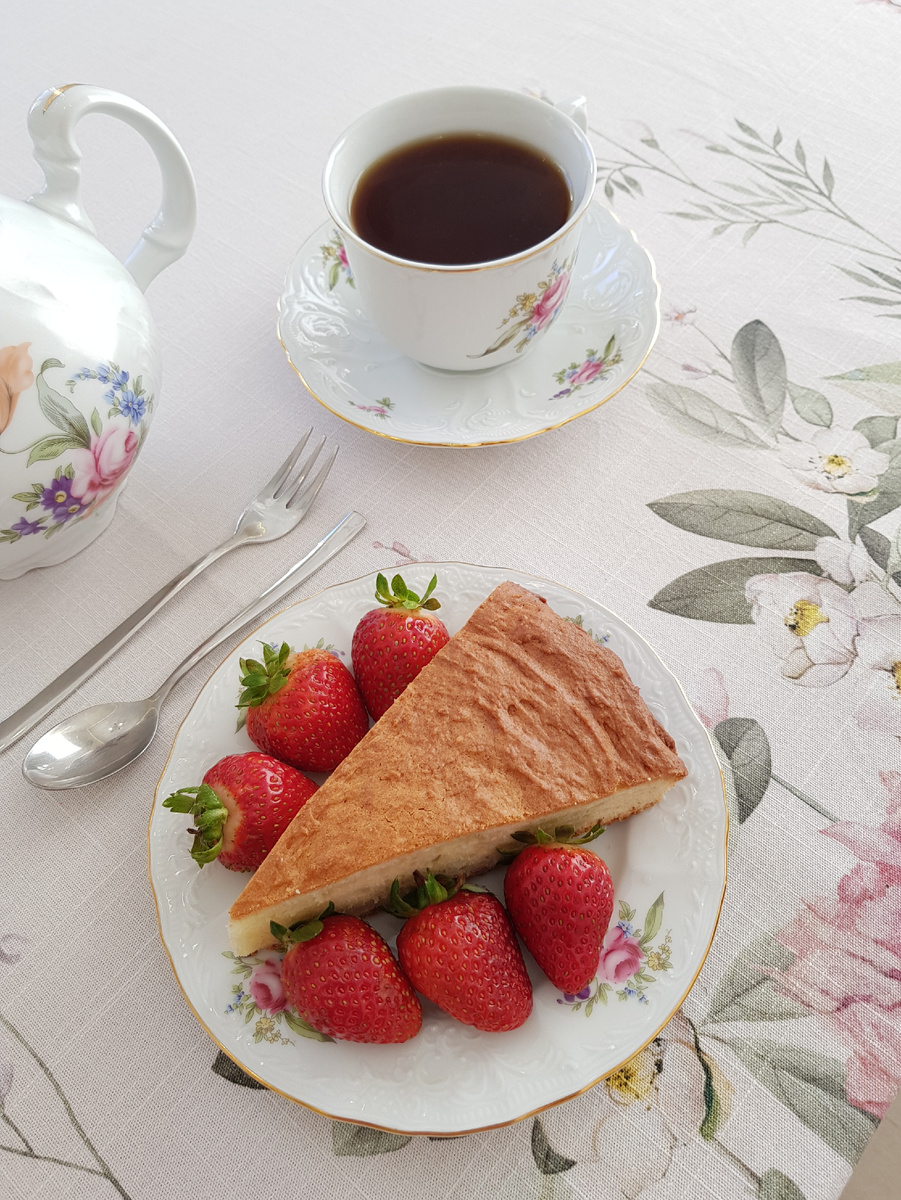 Добрый день, дорогие друзья! Сегодня я представляю вашему вниманию простой творожный пирог, который наполнит дом ароматом ванили, в сочетании с чашкой горячего чая согреет и соберет на вечернюю трапезу любимых и родных. Для приготовления 8 порций нам понадобятся: 250 грамм творога, 3 яйца, 200 грамм сахара, 230 грамм муки, 150 грамм сливочного масла, 1 чайная ложка соды, 1 чайная ложка яблочного уксуса, 1/5 чайной ложки соли, 4 капли экстракта ванили. Для дополнения 8 порций пирога нам понадобятся: 1 килограмм клубники. Приготовление: в чашу измельчителя поместить творог, яйца, сахар и экстракт ванили. Перемешать до однородности. Добавить сливочное масло 140 грамм, перемешать. Соду погасить уксусом и добавить в чашу измельчителя. Просеять муку и добавить ёе в тесто. Перемешать. Жаропрочную форму смазать сливочным маслом. Выложить в форму тесто. Выпекать в течение 50 минут при температуре 170 градусов Цельсия на режиме верхний и нижний нагрев. Достать пирог из духовки, дать ему