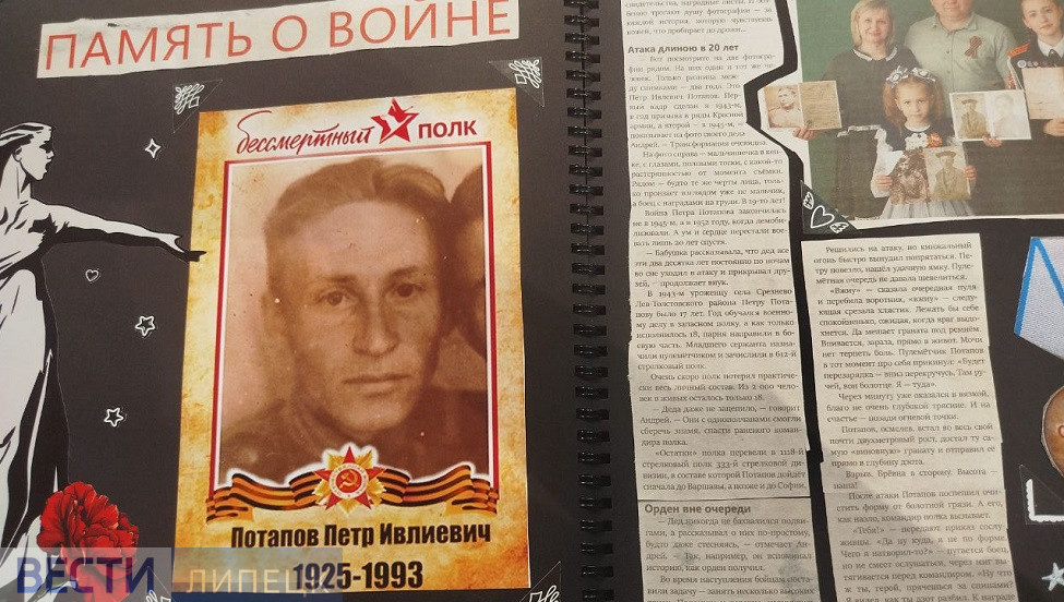 Почти в каждой семье хранятся черно-белые фотографии или фронтовые треугольники, настоящие свидетели военных лет и памяти о тех, кто героически защищал свою землю от фашистов. У супругов Андрея и Елены Лапиных есть несколько военных альбомов, созданных вместе с четырьмя детьми — сыном Игорем и дочками Милославой, Василисой и Евангелиной. — Нам с мужем всегда была интересна тема Великой Отечественной: изучали факты, читали книги, смотрели и обсуждали военные фильмы, — рассказала Елена Лапина. — Каждый год ходим на парад Победы, стараемся посещать разные города: Елец, Задонск, Тербуны, Москва. И, конечно, мы собирали истории о наших прадедах. Начали делать семейный альбом. Сведения искали по крупицам: записывали воспоминания родственников и находили информацию в интернете. Для детей истории о фронтовиках стали очень близки после того, как они узнали, что их прадедушка (дедушка Андрея Лапина), Петр Ивлиевич Потапов, ушел на фронт в 17 лет. По сути, он был всего на несколько лет старше, че