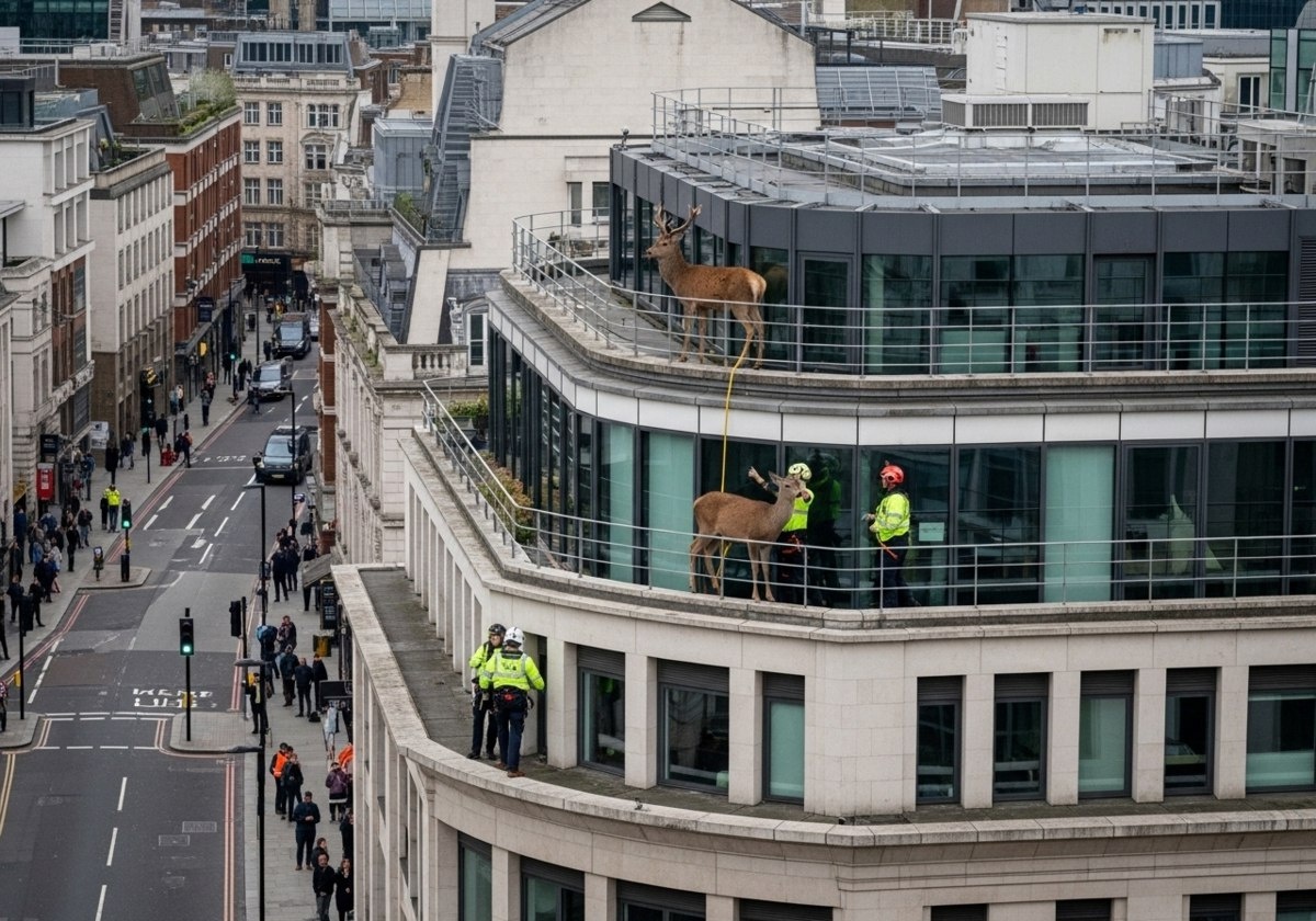В 2018 году в Лондоне прохожие были удивлены, когда на крыше одного из зданий они увидели оленя. Животное, вероятно, заблудилось и каким-то образом забралось на высоту нескольких этажей. Сотрудники спасательных служб помогли оленю спуститься, и случай вызвал большой интерес в соцсетях, став символом неожиданных встреч с дикой природой в мегаполисе.