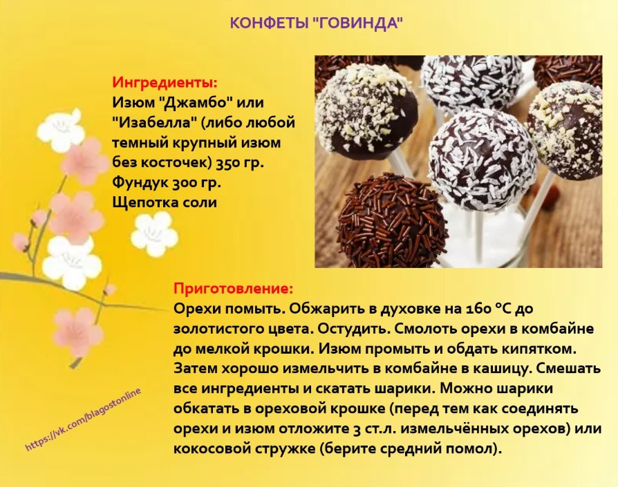 🍫 КОНФЕТЫ "ГОВИНДА" 🌀 Ингредиенты: Изюм "Джамбо" или "Изабелла" (либо любой темный крупный изюм без косточек) 350 гр. Фундук 300 гр. Щепотка соли 🌀 Приготовление: Орехи помыть. Обжарить в духовке на 160 °С до золотистого цвета. Остудить. Смолоть орехи в комбайне до мелкой крошки. Изюм промыть и обдать кипятком. Затем хорошо измельчить в комбайне в кашицу. Смешать все ингредиенты и скатать шарики. Можно шарики обкатать в ореховой крошке (перед тем как соединять орехи и изюм отложите 3 ст.л. измельчённых орехов) или кокосовой стружке (берите средний помол).