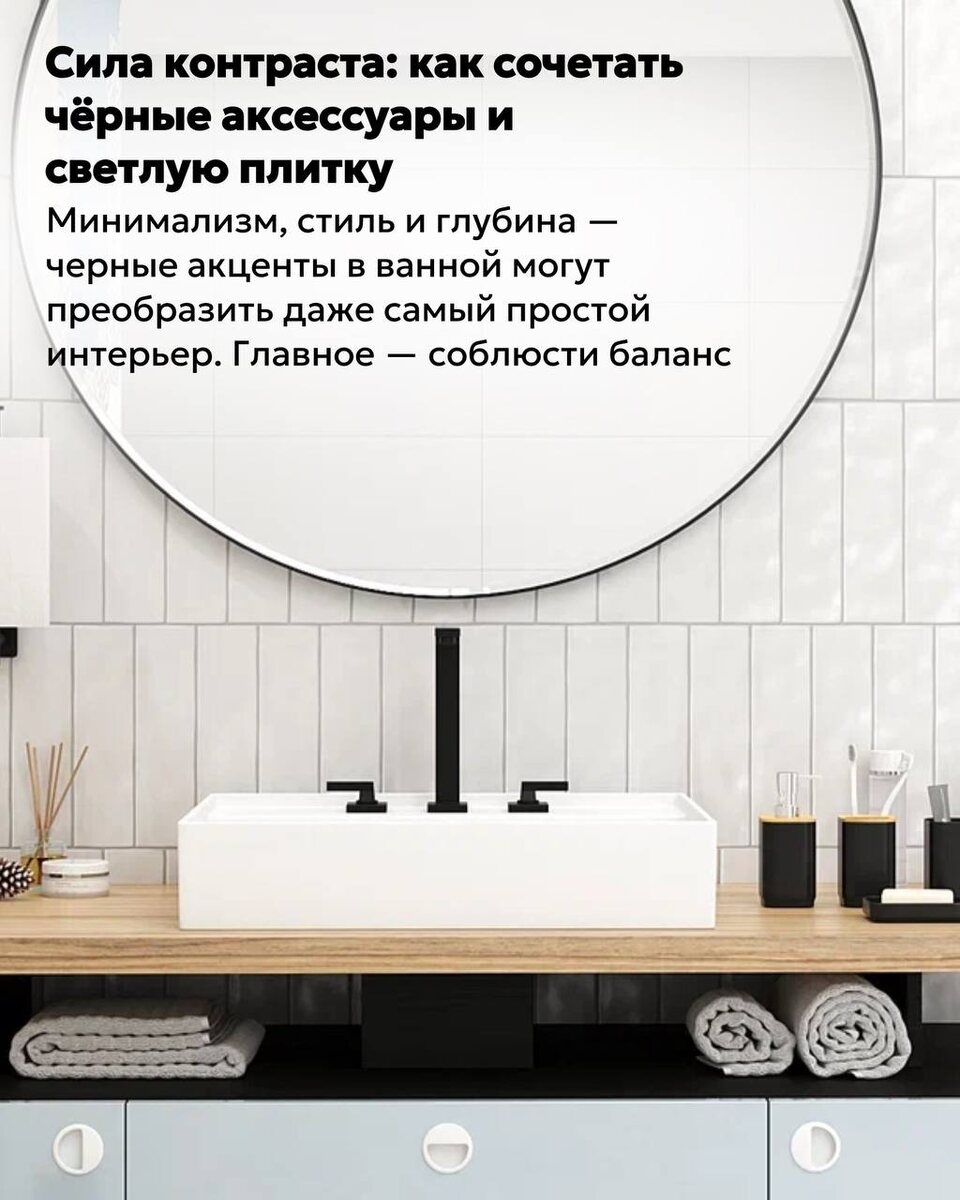 Светлая плитка и чёрные аксессуары создают то самое ощущение стиля, когда даже маленькая ванная выглядит дизайнерской.
