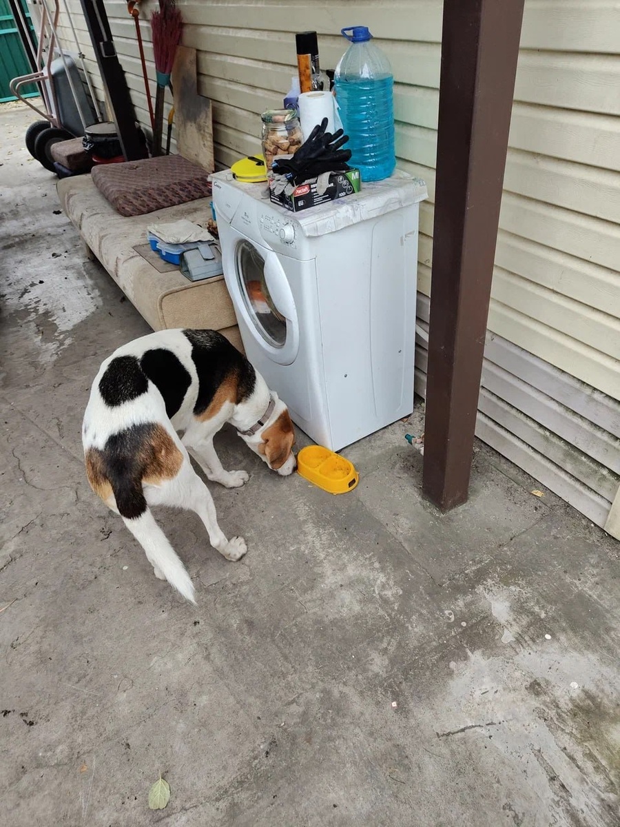 Вот почему кошачий домик у меня высокий. А ежовой миске не повезло, в один мах языком всё выгреб, проглот этакий. Просочился, пока калитка была не закрыта, и опаньки. Так-то пёсель хозяйский, не вредный, просто балбес шебутной.