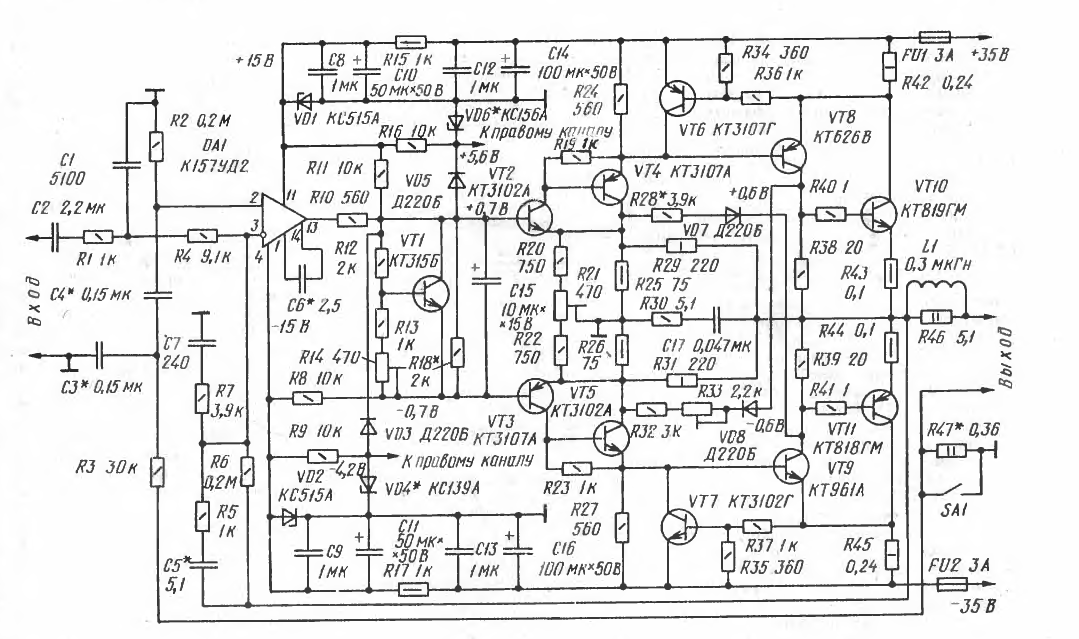 Режим супер А - режим работы транзисторов выходного каскада без отсечки тока в схеме Митрофанова осуществляется при помощи цепочек R28, VD7 и R32, R33, VD8. Транзисторы VT6, VT7 являются ограничителями тока. Без них в этой схеме не обойтись. Почему - будет показано ниже.