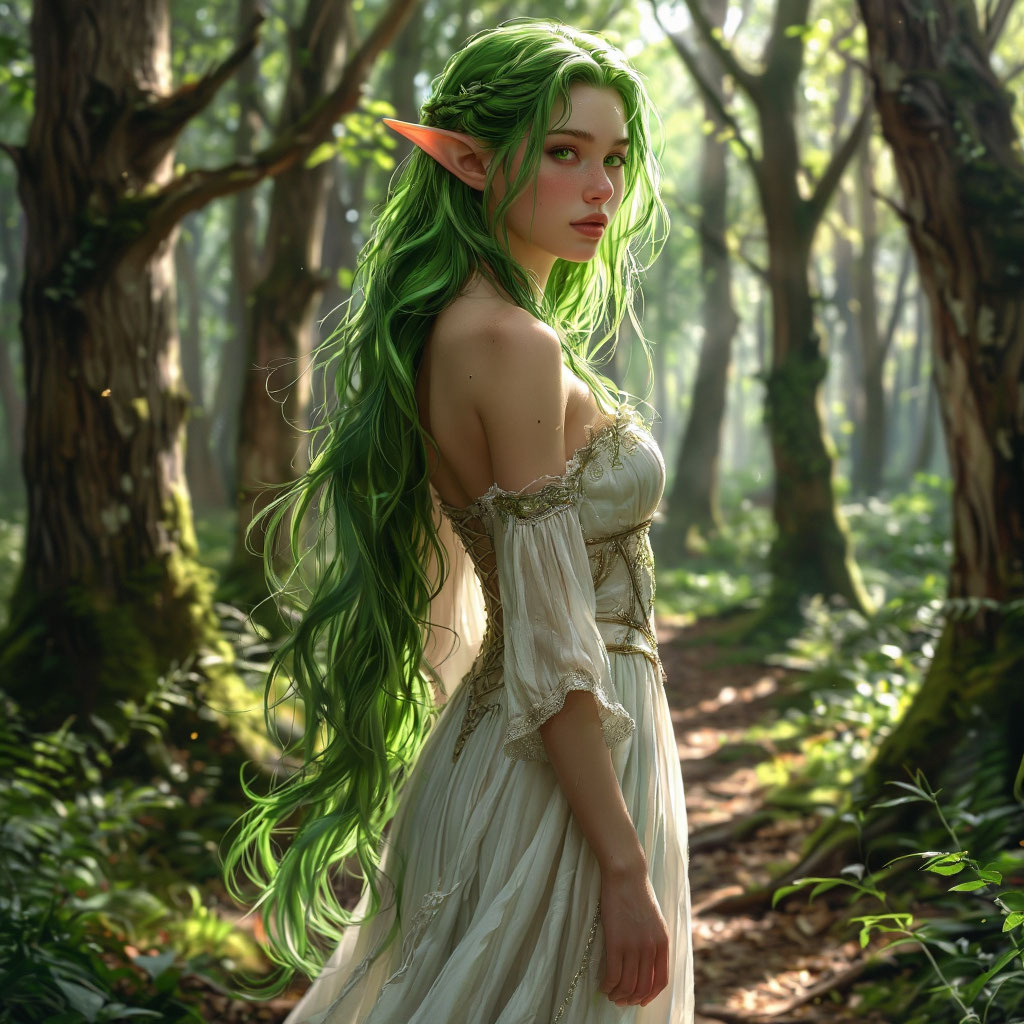 Внезапно впереди мелькнула тень. Из-за ствола кедра, чья кора переливалась словно перламутр, появилось существо. Это был лесной эльф. Он был высок и строен, его движения были плавными и бесшумными, словно он не шёл, а плыл по воздуху. Длинные волосы цвета лунного света струились по его плечам, а глаза, миндалевидные и ярко-зелёные, как только что распустившиеся листья, смотрели на Лиру с бездонной, древней мудростью. Его одеяние было сплетено из живых побегов, паутины и лепестков, и оно меняло цвет, переливаясь оттенками леса.