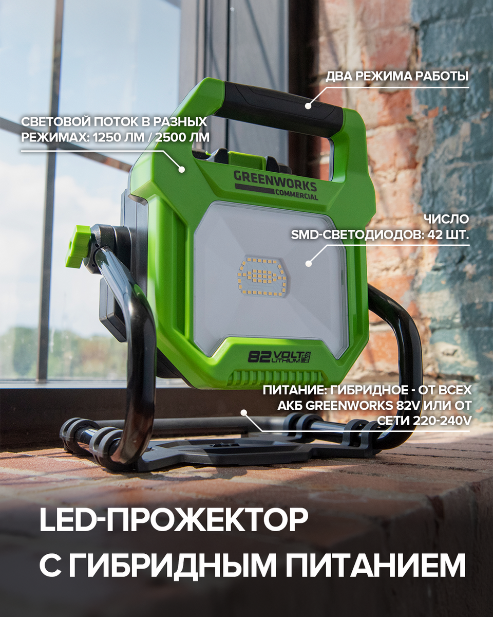 Забудьте о недостатке света в гараже или на строительной площадке с LED-прожектором Greenworks G82WLH (3504007) с гибридным питанием — это мощное устройство, которое станет вашим надёжным помощником в любых условиях: