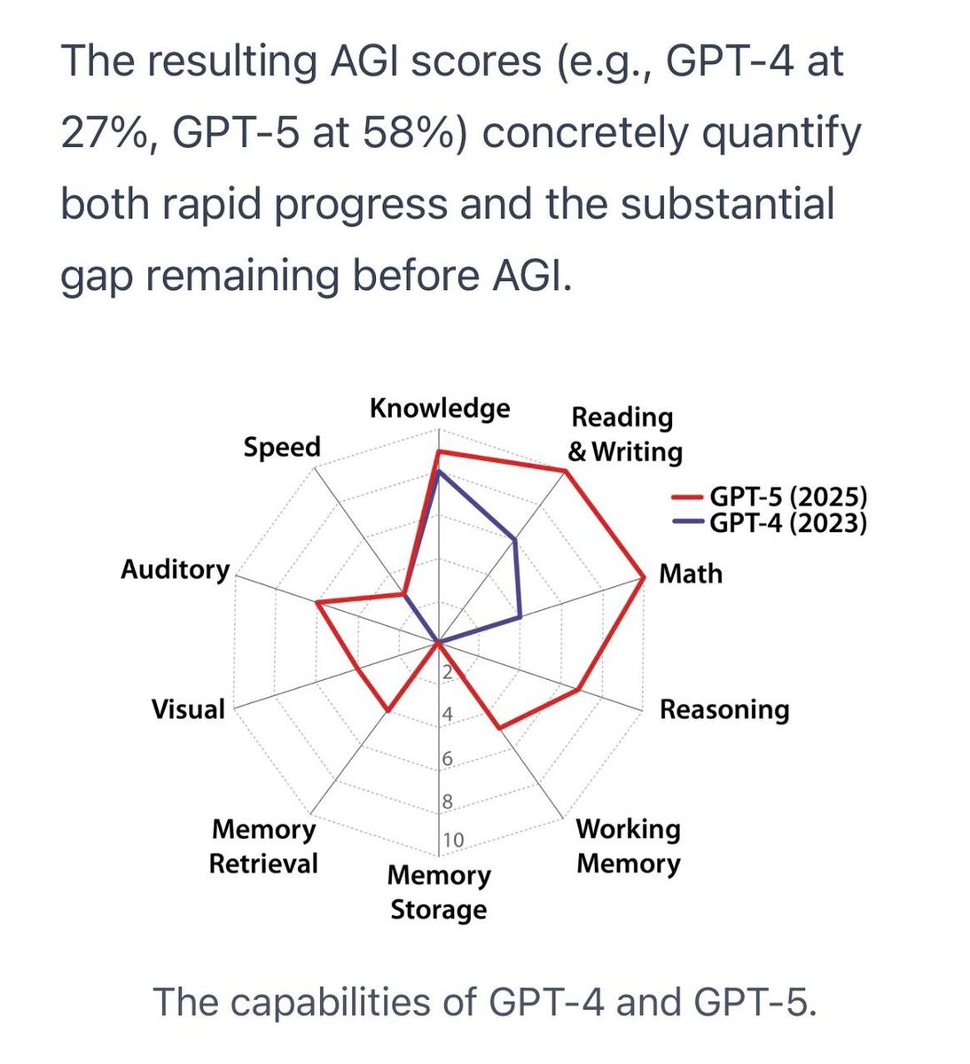 Команда предложила рабочее определение искусственного общего интеллекта: ИИ, который решает когнитивные задачи на уровне образованного взрослого. И сразу подкрутили тест из 10 критериев — рассуждение, память, чтение, обобщение, скорость «мышления» и т.д.