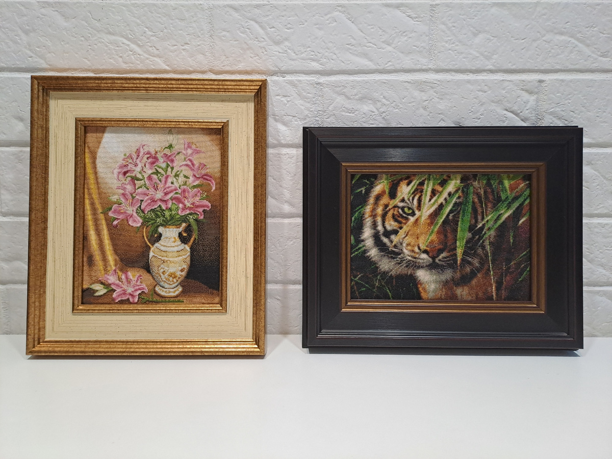 За две оформленных вышивки я отдала почти 8 тысяч, не помню точно, сколько за какую, они вышли примерно одинаково, тигр чуть-чуть дороже. Но плюс-минус около 4 тысяч за каждую. Я не знаю, насколько это дорого сейчас, учитывая, что багет пластиковый, нет стекла, и сами работы маленькие - обе по большей стороне около 20 см. Но оформление сделано очень качественно. Натянули ровно, без скосов и бугров. Под раму ушло не более 1 мм с каждой стороны. Сказали, что если бы оформляли со стеклом, то смогли бы сделать в стык, но из-за того, что без стекла, при взгляде сбоку был бы виден этот крохотный зазор, и было бы некрасиво. Поэтому по 1 мм загнали под раму. Я знаю из интернета, что многие багетки и по 5 мм загоняют, даже если оформляют со стеклом, поэтому очень переживала, действительно ли сделают так, как обещали. И они не разочаровали. Все сделано на высшем уровне. Так что опыт считаю удачным, и теперь без страха буду относить в эту багетку свои будущие финиши.