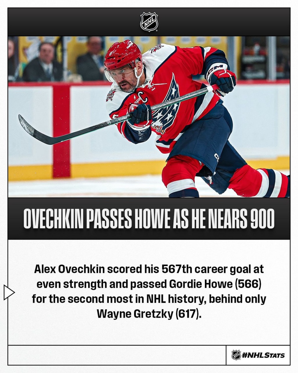 ⚡️ Овечкин обошел Горди Хоу по голам в равных составах. Чтобы стать лучшим в истории, нужно обойти Гретцки, до которого 50 шайб