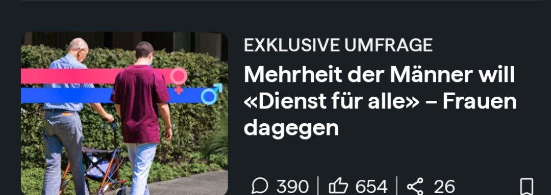 30 ноября в Швейцарии состоится референдум по народной инициативе «За активную Швейцарию (Service-Citoyen-Initiative)». Её цель — заменить обязательную воинскую службу для мужчин на гражданскую службу для всех граждан Швейцарии. Это значит, что и женщины должны будут выполнять Service Citoyen — либо военную службу, либо равноценную общественную службу в сфере сообщества, безопасности или экологии. 🇨🇭 Результаты первого опроса Согласно исследованию института Leewas, проведённому по заказу 20 Minuten и Tamedia, 51 % населения в настоящее время поддерживают инициативу (ответы «Да» или «Скорее да»), 44 % — против, и 5 % ещё не определились. Федеральный совет и парламент рекомендуют отклонить инициативу, без контрпредложения. 👩🦰👨 Гендерный разрыв Инициатива напрямую затрагивает женщин, поскольку для мужчин уже действует обязанность службы. Поэтому опрос показал чёткую разницу между полами: 60 % мужчин готовы проголосовать «за», 35 % мужчин — против. А вот среди женщин только 42