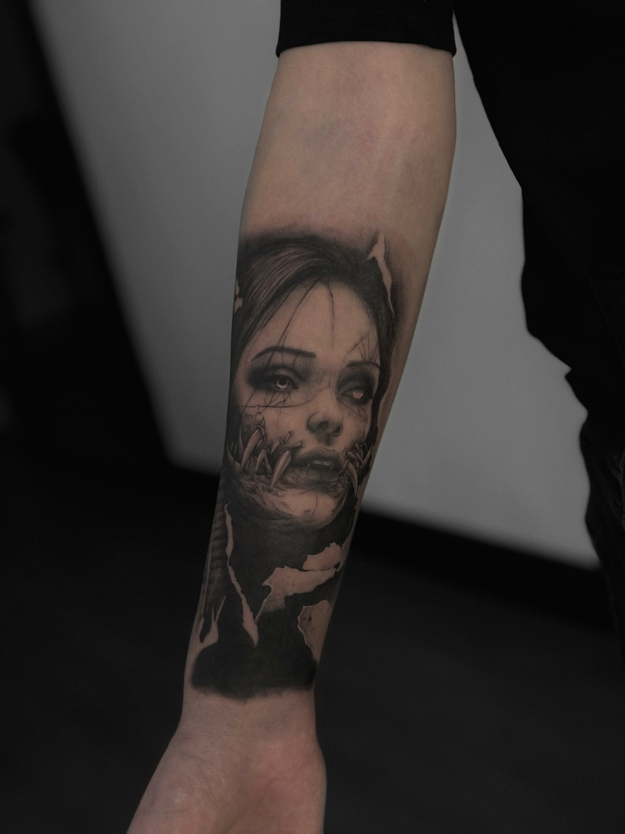 Этот стиль отлично подходит для тех, кто хочет подчеркнуть свою индивидуальность или интерес к мрачной эстетике. В хоррор-тату прослеживаются детали и атмосфера, создающие ощущение загадочности и напряжения, что делает такие работы по-настоящему уникальными и запоминающимися #realism #tattoorealism #horrortattoo