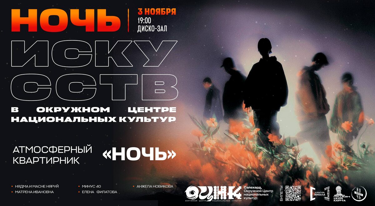 ✨ Атмосферный квартирник «Ночь» в рамках «Ночи искусств 2025» ✨ 🌙 3 ноября в 19:00 приглашаем вас на особенный квартирник «Ночь», который пройдёт в рамках Всероссийской акции «Ночь искусств» в Окружном Центре национальных культур. Для вас выступят: - Нядма и Масне Няруй - Матрена Ивановна - группа «Минус 40» - Елена Филатова - Анжела Новикова Приходите, чтобы погрузиться в мир искусства, насладиться живым звуком и разделить эти незабываемые моменты с нами. Это идеальный повод отдохнуть от суеты и вдохновиться творчеством! Билеты можно приобрести по ссылке: clck.ru/3Pnub4. * все билеты можно приобрести по Пушкинской карте или через сервис «Морошка» со скидкой 20% 💳 #ОЦНК #НочьИскусств2025