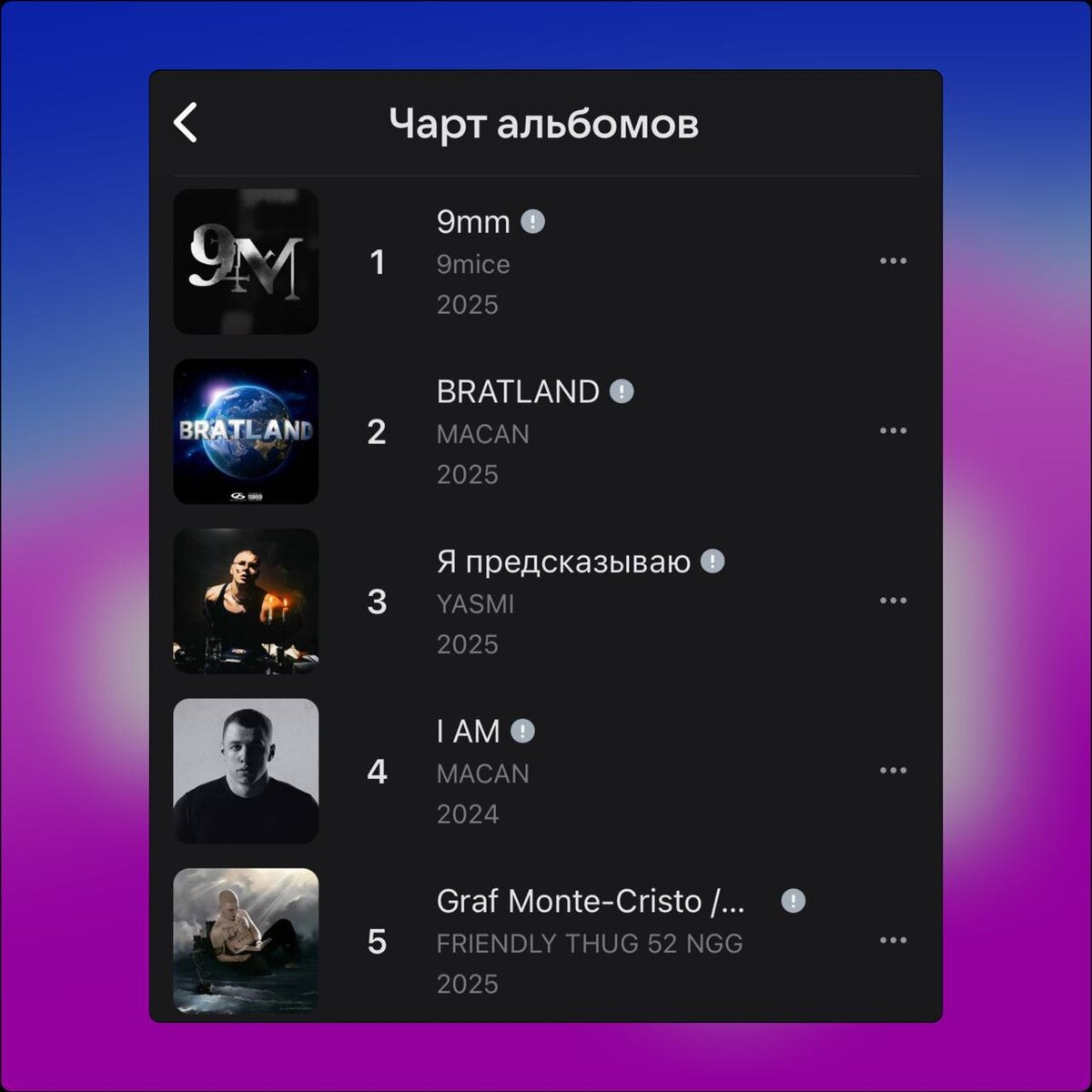 👑 🎵 В чарте альбомов в VK Музыка — лидирует 9mice «9mm» Долгое ожидание релиза сыграло ему на руку и он лихо запрыгнул в чарте. Также из новинок в чарт альбом попал альбом группы Бонд с кнопкой «Дом» — 8-е место. В чарте песен: • ICEGERGERT, Zivert «БАНК» — 👑 1-е место; • INSTASAMKA «AGENT GIRL» — 20-е место; • Бонд с кнопкой «Сидр» — 50-е место; • 9mice «famous» — 82-е место; • FEDUK Пью вино» — 86-е место; • Хаски «Я объявляю вам войну» — 96-е место. @mainstreamusic