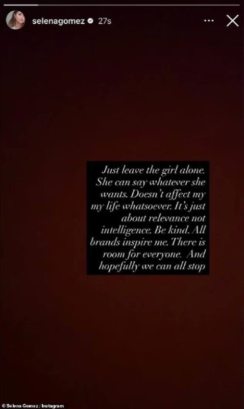 В недавнем интервью WSJ Бибер при упоминании Селены выдала, что «не чувствует соперничества с людьми, которые ее не вдохновляют». Гомес, которая сейчас вообще в медовом месяце с мужем Бенни Бланко, включила телефон только ради ответа коллеге-миллиардерше. «Она может говорить все, что захочет. Это никак не влияет на мою жизнь. Главное не то, насколько ты умно говоришь, а насколько уместно. Будьте добрее. Меня вдохновляют все бренда. Место есть для каждого. И, надеюсь, мы на этом закончим».