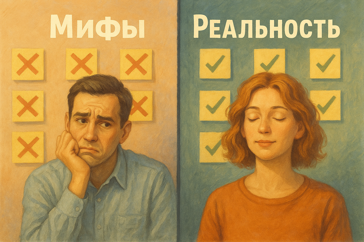 Я - психолог. На приёме клиент говорит: «Если не под стрессом — ничего не делаю». Через десять минут разбора дня видно: его «мотор» держится не на стрессе, а на ясных шагах и коротких дедлайнах. Стресс лишь делает дыхание короче и сужает взгляд. Мифы мешают — факты помогают. В этой статье — 10 популярных стереотипов о стрессе и как всё устроено на самом деле: что действительно запускает перегруз, что наоборот возвращает ясность, и какие простые действия можно добавить уже сегодня. Стресс — это режим тела (пульс выше, выдох короче, внимание туннельно), а не «слабость характера». Когда среда шумит (телефон, недосып, хаос задач), этот режим включается по любому поводу. Мы списываем на себя то, что запускает контекст. 1) «Стресс — топливо продуктивности» ⚡