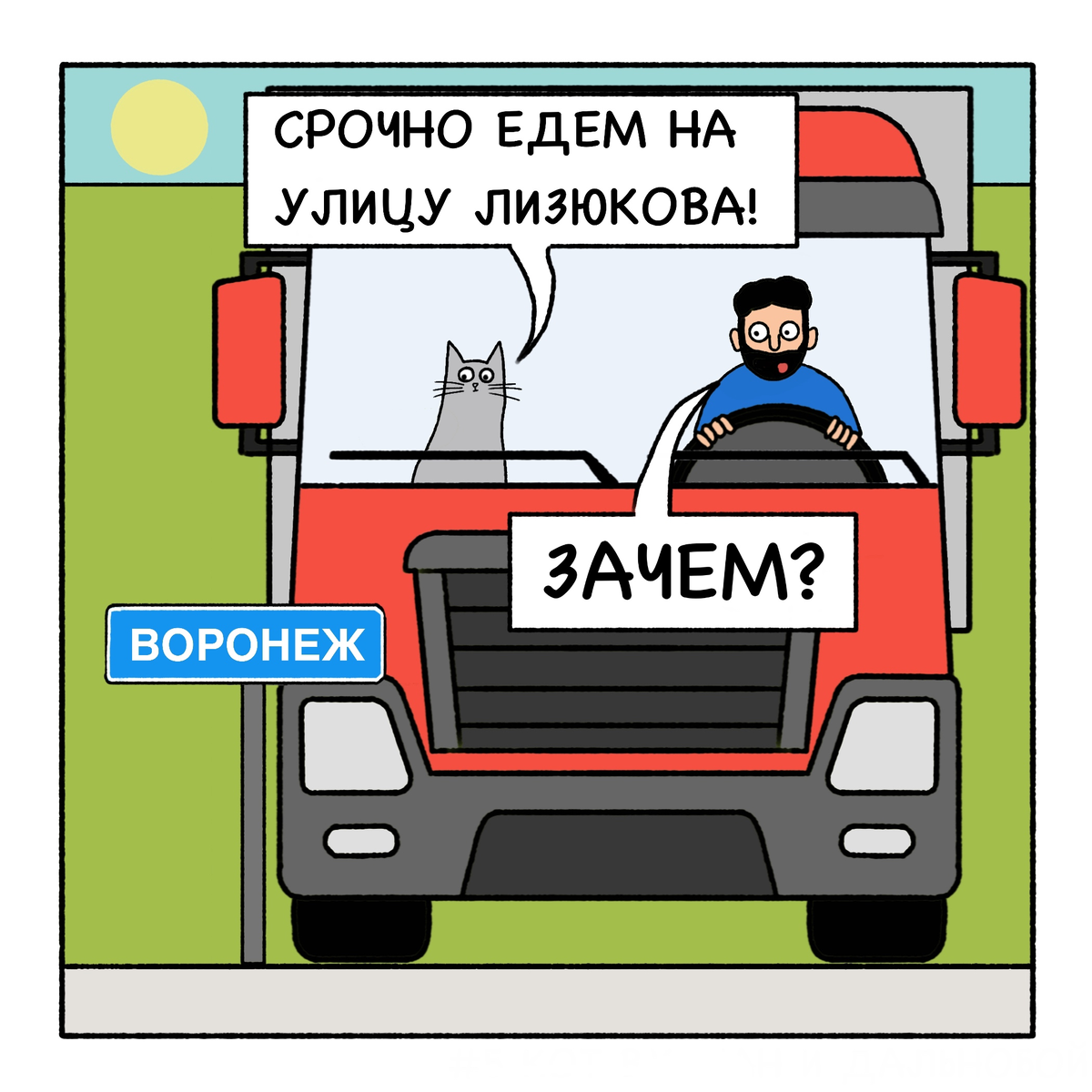 Кот Вулкан и дальнобой каждый день проезжают разные города! И в каждом городе с ними случаются маленькие приключения. Вот например в Воронеже они успели даже сфотографироваться с памятником: А вы смотрели такой мультфильм? В Махачкале кот Вулкан решил сделать так, чтобы не выделяться среди местных жителей: А вы тоже покупаете сувениры, находясь в другом городе? Герои нашего комикса, обязательно следуют этому правилу: А как думаете, где самые вкусные арбузы? В столице закатов обязательно возьмите с собой солнцезащитные очки: Ну и заскочили в город невест на денёк, и даже нашли: Надеюсь вам понравилось, ну а я сажусь рисовать следующий выпуск😁 Если есть желание поддержать моё творчество, вы всегда можете сделать это нажав на кнопочку «поддержать» в конце этой статьи, или же прямиком на карту: 4276610019940902 Всем спасибо за просмотр! И до новых встреч!