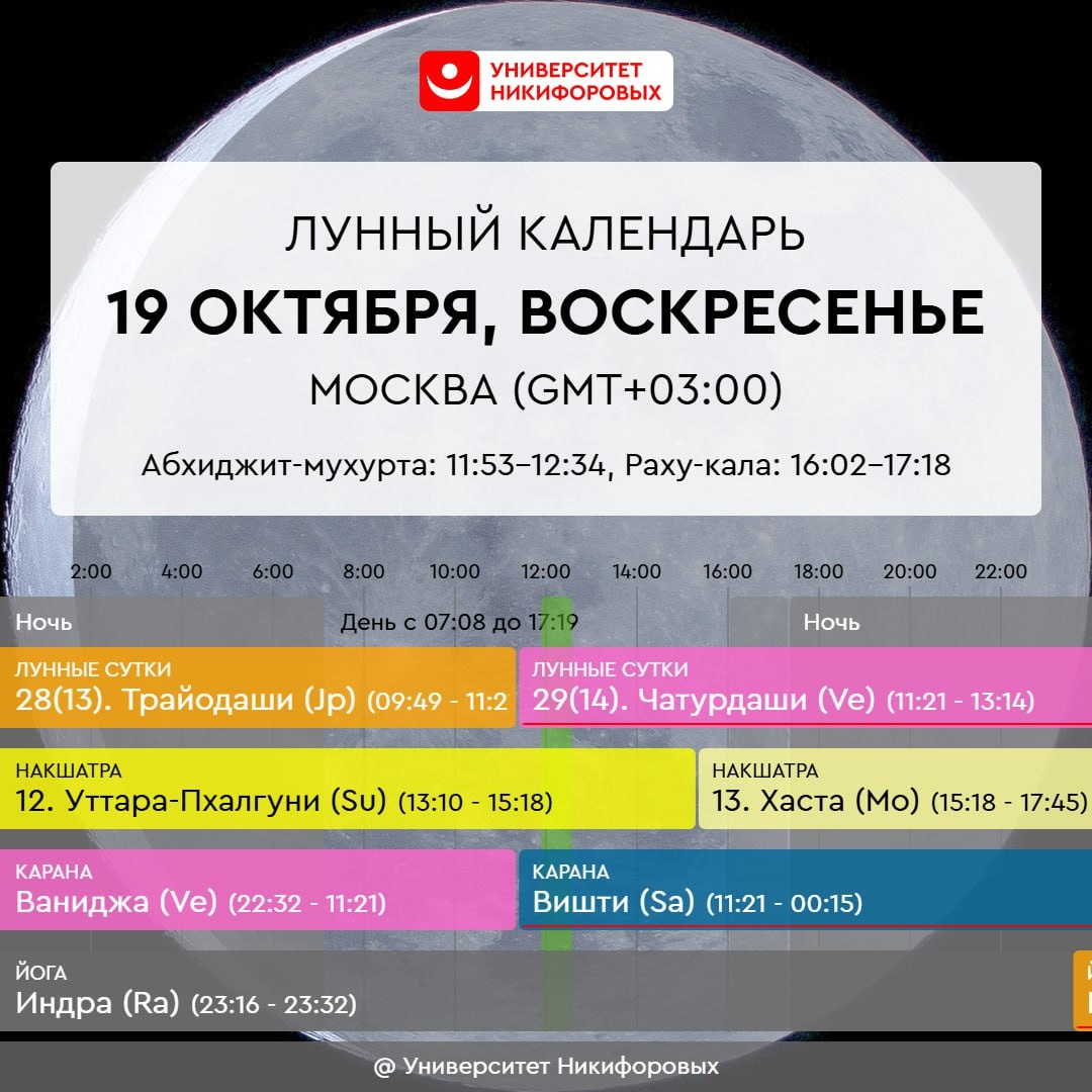 19 ОКТЯБРЯ, ВОСКРЕСЕНЬЕ Энергетика дня достаточно спокойная, и она лучше всего подойдет для отдыха без бурной включенности в какие-то дела и заботы. Хорошо посетить храм, пожертвовать на благотворительность, выразить уважение отцу, начальнику или человеку, который выше вас по иерархии. Не обязательно это делать лично – можно в просто подумать с благодарностью о том, что ценного эти люди вам дали. Если ваши отношения с отцом это позволяют, запланируйте совместное времяпрепровождение или общение с ним. После 11:21 время сопутствует очищению и избавлению от отжившего. Благоприятно читать мантру Шиве, обращаться к нему с молитвой как к воплощению энергии праотца всего сущего. Можно просить его о разрушении того, что мешает нашему духовному росту. Нервная система испытывает напряжение, в ближайшие дни может быть непросто синхронизировать свои мысли с физическими ощущениями, слова – как наши, так и окружающих людей – могут расходиться с действиями.