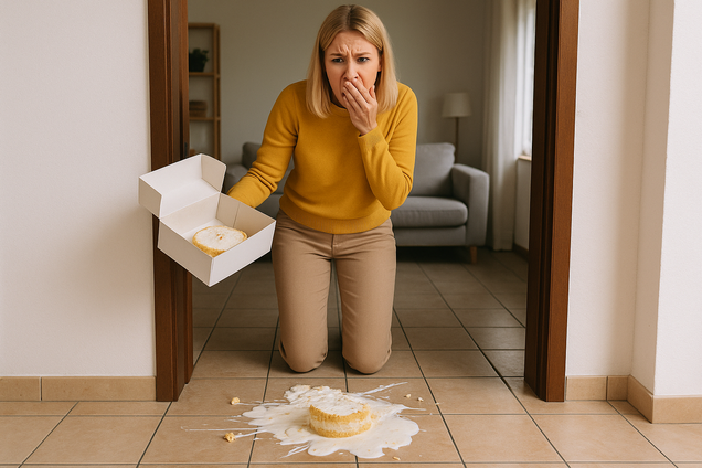 Полина чувствовала, как торт выскальзывает из рук. Он упал на пол с глухим шлепком. Коробка раскрылась, бисквит размазался по плитке.