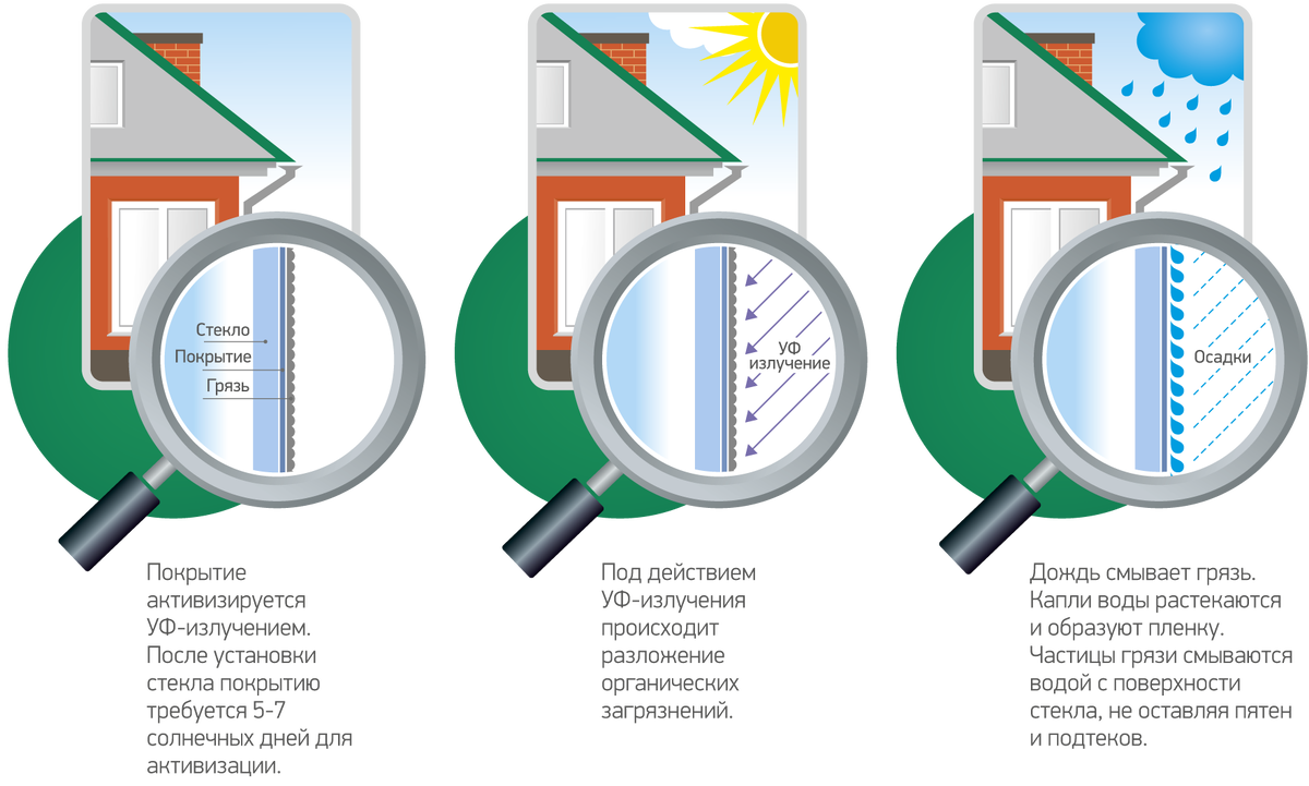 На внешнюю поверхность стекла в процессе производства наносится ультратонкое, прозрачное покрытие на основе диоксида титана. Этот полупроводниковый материал выступает в роли фотокатализатора. Его функция заключается в следующем: