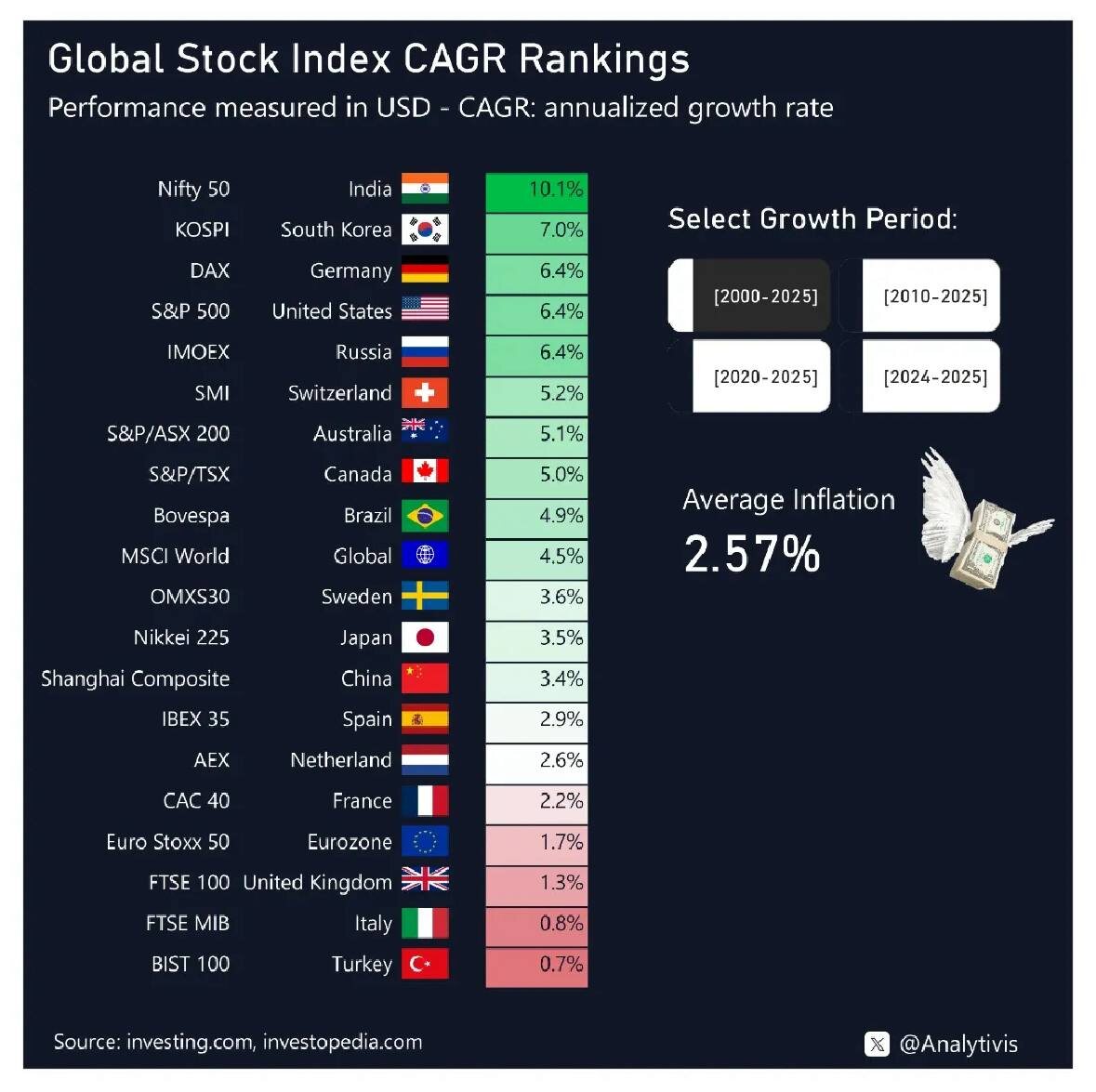 📈 Как менялись мировые рынки за 25 лет, и где сейчас Россия Кто реально зарабатывал на фондовых рынках в разные периоды👇 🔹 2000–2025 Победитель - Индия (10% в год), США и Германия рядом. 🇷🇺 Россия держится в топе с 6,4% в год - отличная цифра, если вспомнить всё, что за эти годы с нами происходило 😀 🔹 2010–2025 🇺🇸 S&P 500 безоговорочный лидер (12,3% в год), а 🇷🇺 Россия в минусе –2,9% в долларах. Не потому что бизнес плох, а потому что рубль за эти 15 лет почти упал в бездну. 🔹 2020–2025 Вот тут начинаются сюрпризы. В лидерах Испания, Италия, Германия, которые десятилетиями считались скучными. А 🇷🇺 МосБиржа снова внизу: –1,6%, в долларах. Санкции, ограничения, низкая ликвидность, всё как всегда. 🔹 2024–2025 И вот тут внезапно 🇷🇺 Россия +18,2%, и снова входит в “зелёную зону” рядом с США и Китаем. Сложно сказать, надолго ли, но пока тренд хороший - идёт восстановление после падения 2022–2023 годов. ❓Финансисты, верите в наш рынок? 👍👎