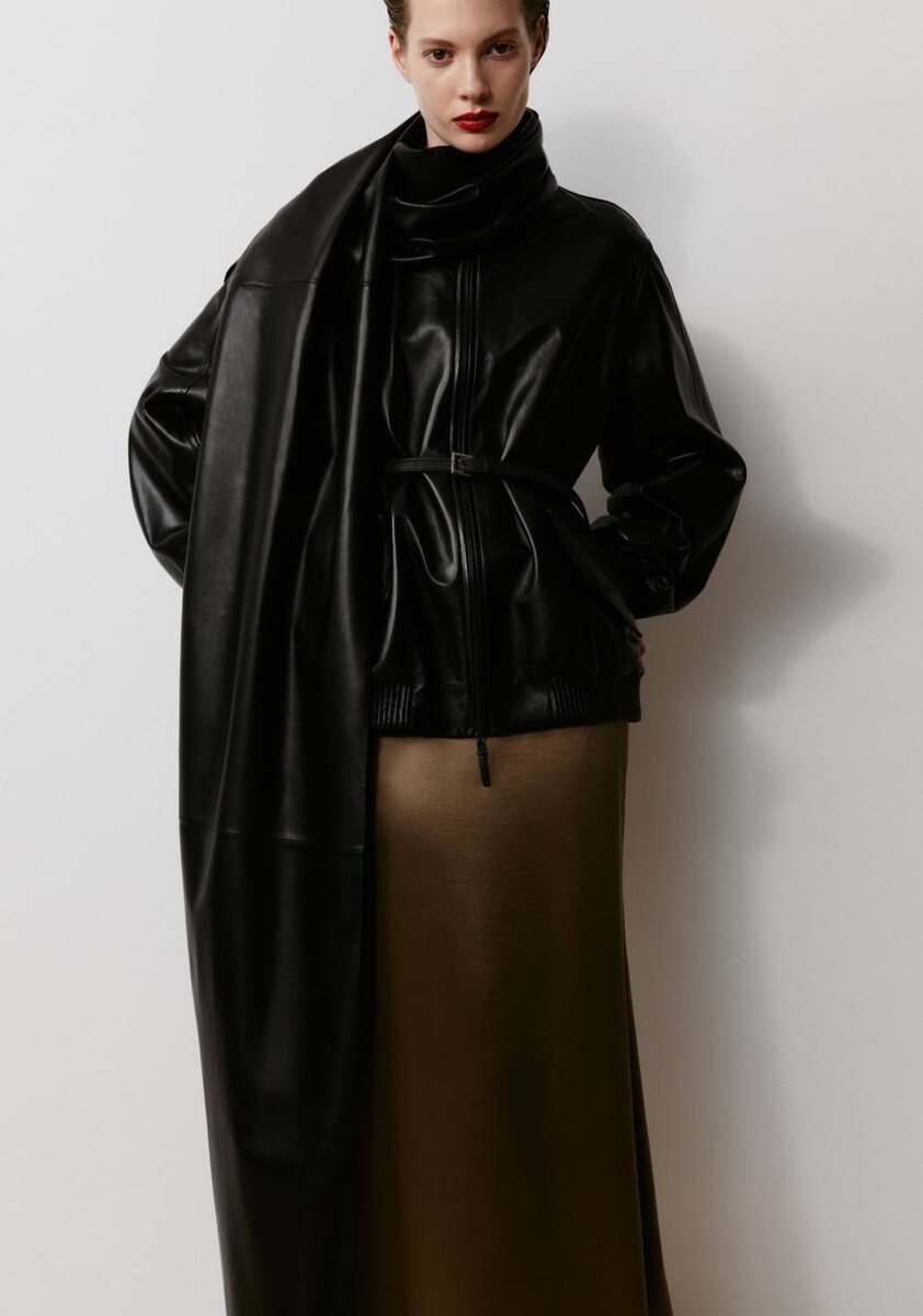 Шарф из французской кожи IZETA, кажется, способен не только дополнить образ, а сформировать его структуру: плотная кожа держит форму