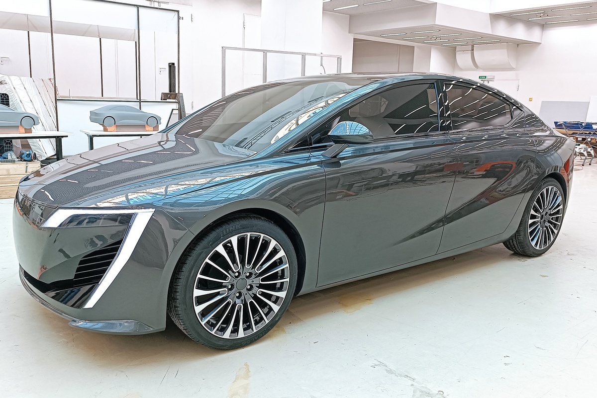 Внешность «Молнии» подана как визитная карточка проекта. Силуэт близок к современным гран-купе с длинной линией крыши и коротким передним свесом, а проработанные аэродинамические элементы (гладкие панели, скрытые ручки, минимальные выступающие детали) подчёркивают электрическую природу машины.