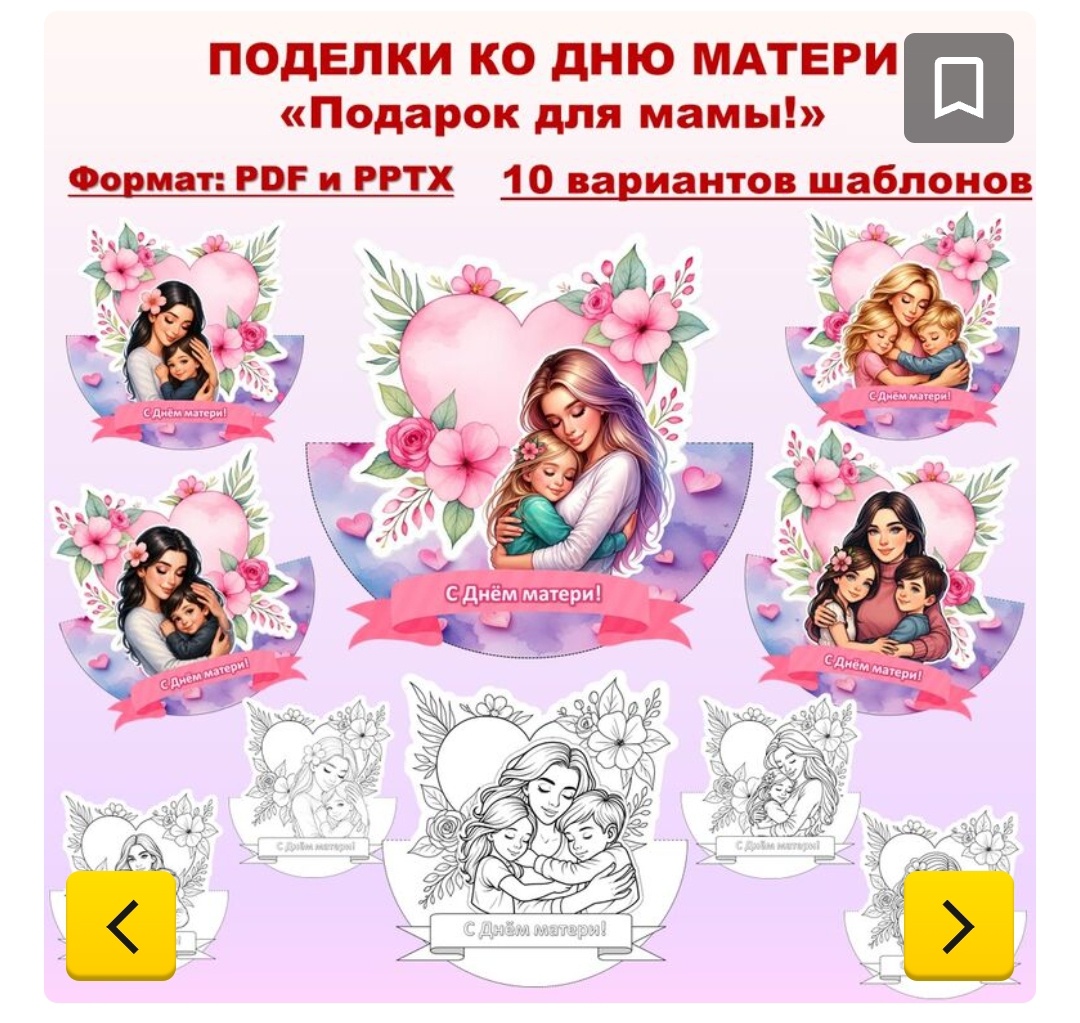 Поделка ко Дню матери "Подарок для мамы". Открытка (поделка) на "День Матери". Поделка ко Дню матери "Подарок для мамы". Предлагаемый комплект включает десять вариантов шаблонов. 1. Шаблоны поделки в чёрно-белом варианте. Черно-белый вариант можно распечатать, вырезать и наклеить на цветной картон или цветную бумагу. Также можно раскрасить шаблоны самостоятельно с помощью красок, цветных карандашей и фломастеров. 2. Шаблоны поделки в цветном варианте. Цветной вариант поделки легко распечатать, вырезать и собрать с помощью клея. Это позволяет использовать материал как для оформления, так и для творческой деятельности на классном часе, внеклассном мероприятии или занятии в детском саду. Открытки «С Днём матери!», открытки-поделки на день матери. Цветные шаблоны упрощают процесс создания поделки: Вырезание элементов: • Аккуратно вырежьте все детали строго по обозначенному контуру • Будьте внимательны при работе с мелкими элементами Обработка основы: • Найдите круглую деталь — э
