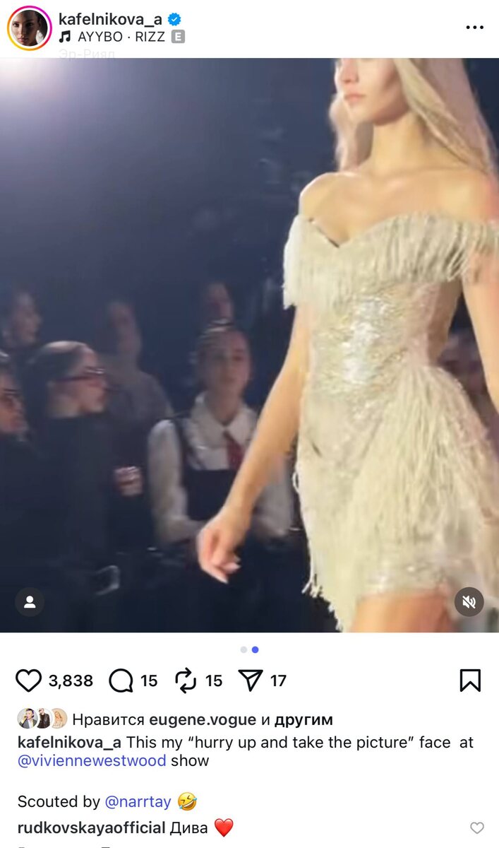 Алеся Кафельникова дефилирует в миниплатье с выразительным декольте на показе Vivienne Westwood (!) в Эр-Рияде