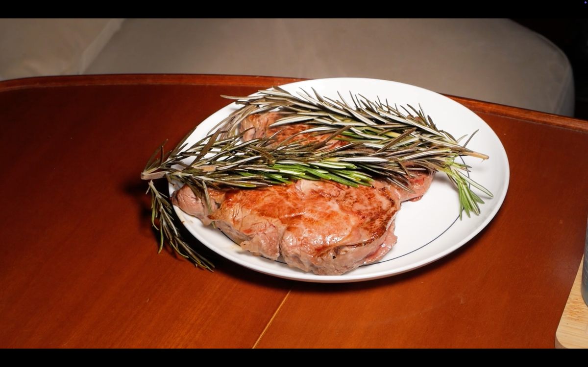 Аркадий: А вот уже у нас подходит стейк. 6-7 минут, до подрумянивания с двух сторон. Прожарка, конечно, зависит от того, кто что любит. Ре, медиум, велдан, надо по времени корректировать, какая прожарка требуется. Потом выключаем сковородку и кладем сверху под крышку розмарин и даем отдохнуть мясу 5 минут.