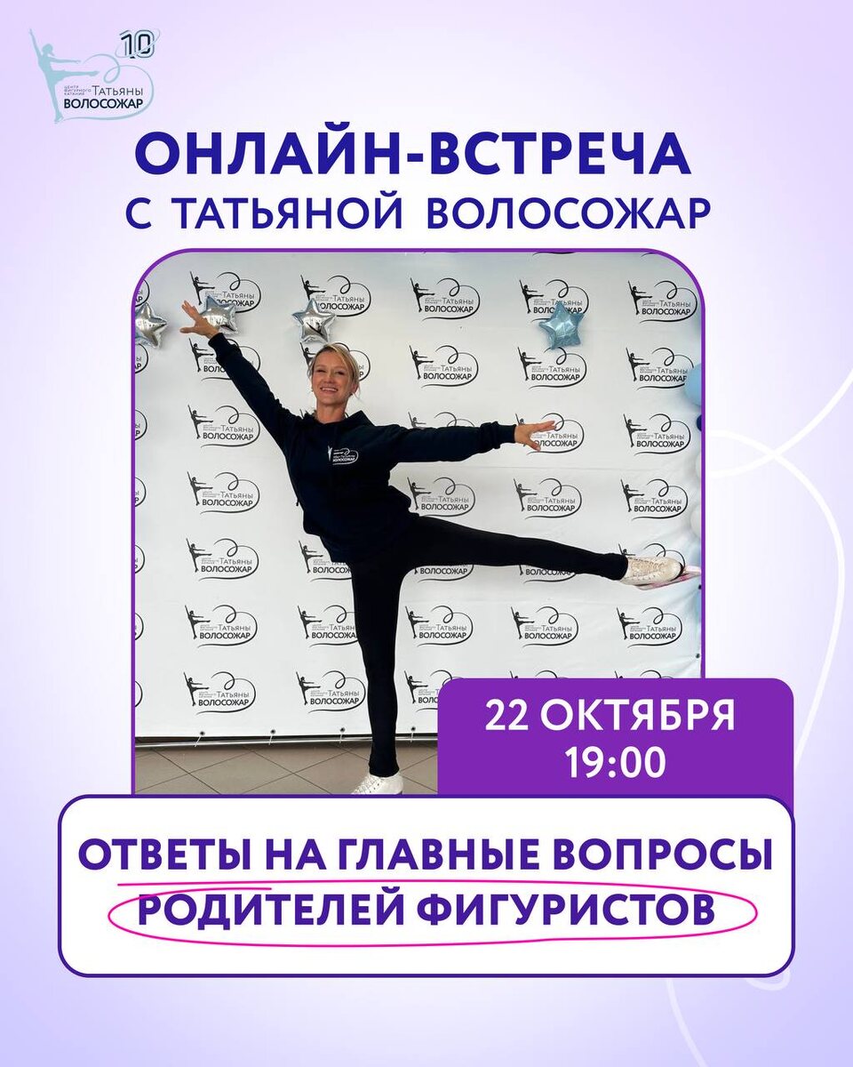 Онлайн-встреча с олимпийской чемпионкой Татьяной Волосожар! Татьяна поделится своим многолетним опытом и ответит на самые частые и волнующие вопросы родителей фигуристов о подготовке спортсмена❄️ А ещё — у вас будет возможность задать свой личный вопрос 💬 🎁 В конце встречи — подарок для каждого участника! 🗓 Когда: 22 октября, 19:00 📩 После регистрации вы получите ссылку на подключение. 👉 Заполните форму и присоединяйтесь к живому разговору с Татьяной Волосожар — о детях, спорте и мотивации!