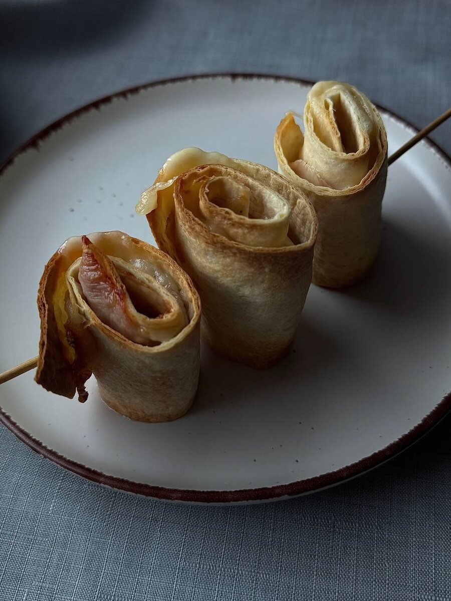 Закуска рулет из тортильи и бекона Тортилья 1 лист Сыровяленый бекон 3 слайса Твердый сыр 50 г. Лист тортильи нарезаем ровными полосками. На каждую полоску выкладываем слайс бекона и нарезанный твердый сыр. Заворачиваем каждую полоску в рулет. Нанизываем на деревянную шпажку каждый рулетик и отправляем в аэрогриль на 10 минут при температуре 180 градусов. (Либо в духовку на 10 минут при температуре 180 градусов). Готово ✔️ #закуска#бекон#тортилья#сыр#рулет#пп