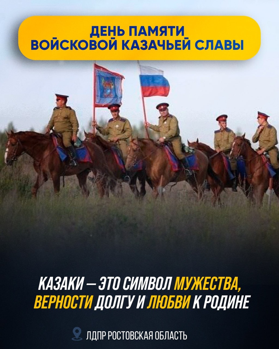 ЛДПР на Дону: помним, гордимся и продолжаем традиции казачества! 🇷🇺 18 октября в России отмечается День памяти войсковой казачьей славы — дату, объединяющую поколения защитников Отечества. В этот день вспоминают о героизме казаков, их вкладе в укрепление и защиту государства, а также о том, что донское казачество навсегда вписано в историю России. ⚡️ Праздник был учреждён более 20 лет назад по инициативе войскового казачьего общества «Всевеликое войско Донское». Он посвящён сражению под Лейпцигом 18 октября 1813 года, когда казаки под командованием Ивана Ефремова сыграли ключевую роль в победе над французской армией. Тогда казаки не только остановили наступление противника, но и взяли в плен около 15 000 солдат Наполеона. ⚡️ Сегодня донское казачество вновь стоит на страже Родины. Более 50 000 казаков приняли участие в зоне СВО, свыше 4 000 удостоены государственных наград, включая звание «Герой России». «Казаки — это символ мужества, верности долгу и любви к Родине. Их подвиги —