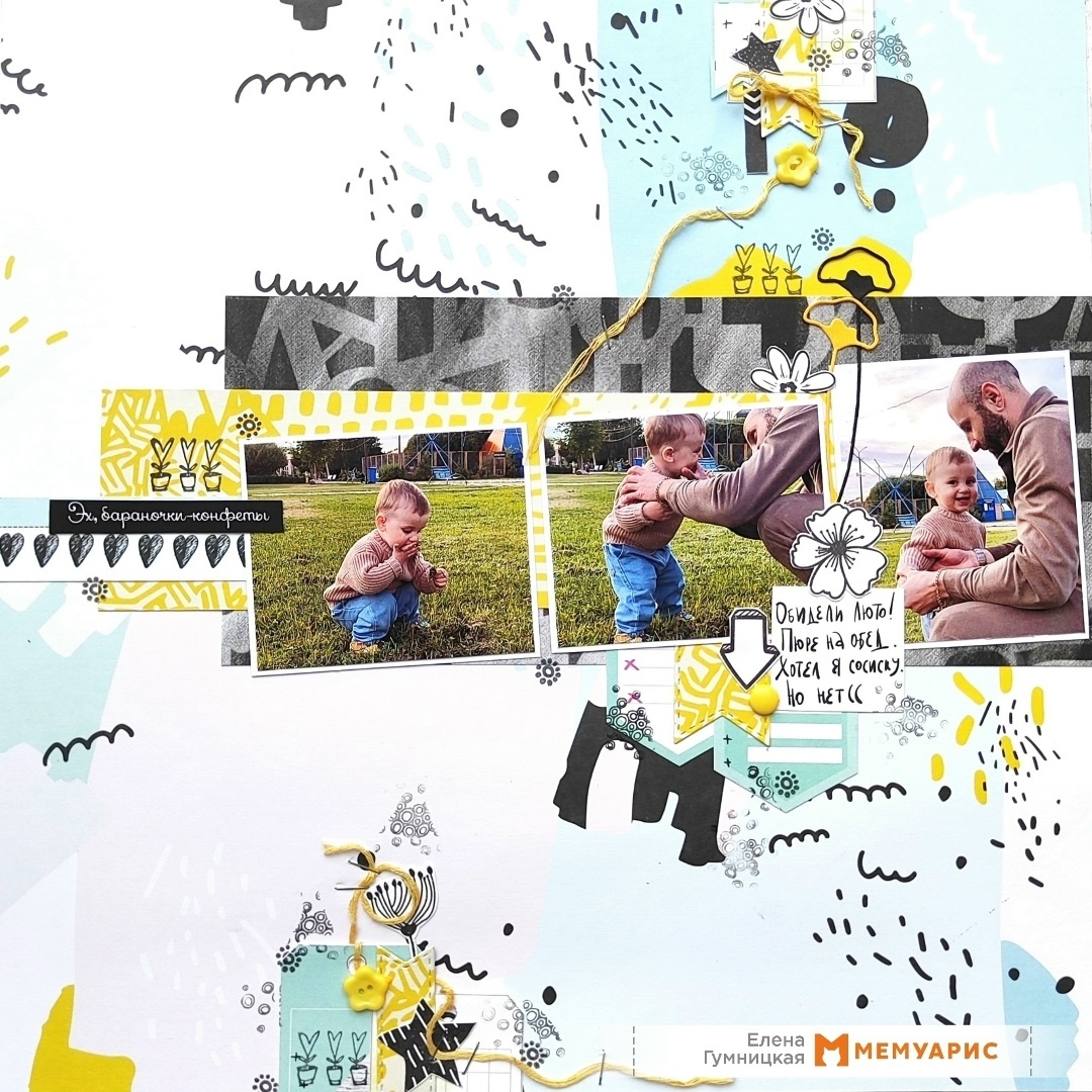 Большая у меня семья, но главный в ней, конечно, Я! Так и есть! Самое вкусное самым маленьким, новые игрушки тоже, а как часто меняется гардероб, позавидует любая красотка))) Странички с папой и мамой были сделаны параллельно, но когда я их положила рядом, они оказались очень близкими по цвету, можно сказать парные) Итак, первая страничка папская) Гуляли в парке, и на зубок надо попробовать все, что под ногами, на фото тот самый момент - проба и помощь папы. Основа - лист бумаги Артелье, моя любовь! Цветные пятна и дудлинг, невероятно эффектно!!! Под фото пара обрезочков бумаги в цвет основе. Надпись из набора карточек «Страна МО», цветочки - высечки из набора «Мир фантазий» от Paper Home, идеальное сочетание) Штампинг, пуговки и ниточки, закрепленные скобочками, отлично подходит вырубка очень тоненькие цветочки. И никак без говорилки, надписи на все случаи жизни. Вторая страничка - мамская! И снова прогулка. Есть у нас местечко на берегу Северной Двины, где профессор Амалицкий проводи