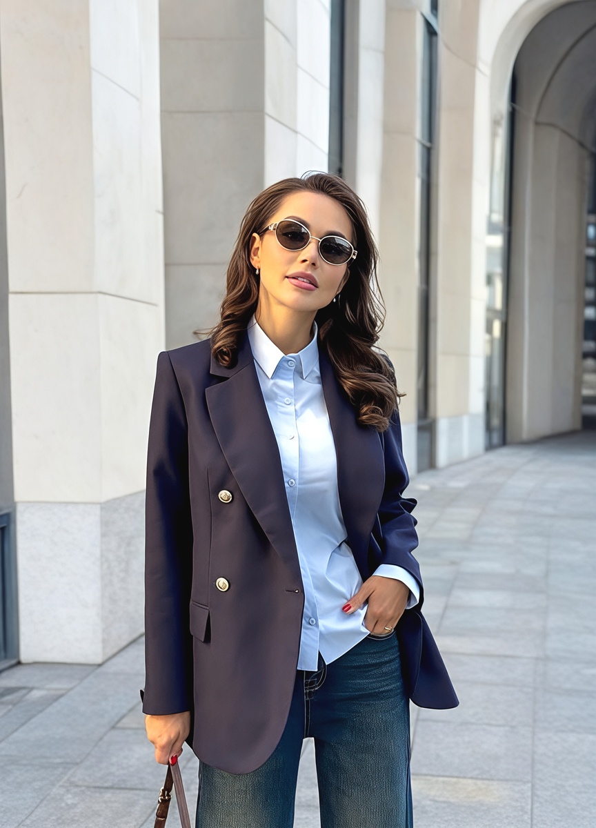 Жакет классического кроя в тёмном цвете решает множество задач. Структурированные плечи, приталенный силуэт, длина чуть ниже бедра — такой фасон идёт большинству фигур. Ткань должна быть достаточно плотной, чтобы держать форму, но не жёсткой.