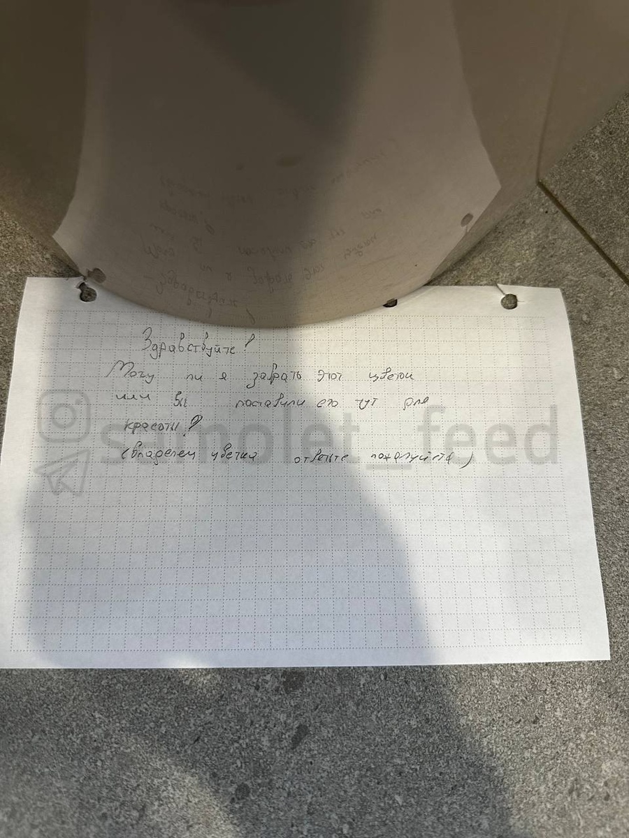 UPD: Цветок вернули на место. Интересная история произошла в одном доме на улице Камова На этаже кому-то понравился цветок и некто решил оставить записку, может ли он забрать цветок. Ответа в итоге не последовало, а цветок пропал. ________ Присылать новость @mstislavz 👉 Обсудить в чате ЖК 👉 Подписаться на канал
