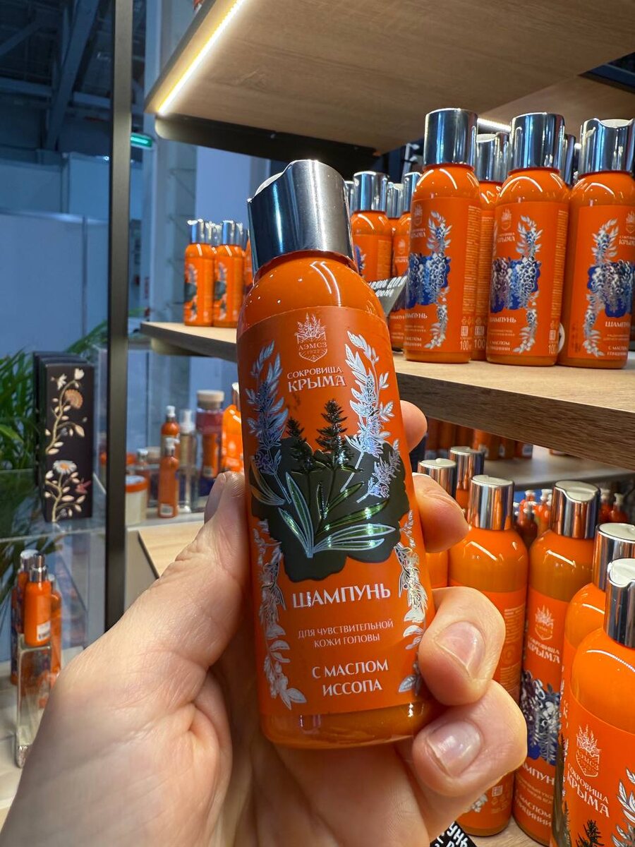 Тоже найден на InterCHARM. Мягкий шампунь с экстрактами и маслами крымских растений, например иссопа или глицинии от «Сокровищ Крыма». Объем 100 мл очень удобен для поездок.