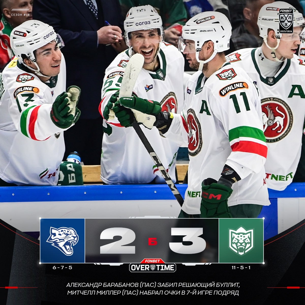 🟢 «Ак Барс» упустил преимущество в две шайбы, но сумел вырвать седьмую победу подряд!