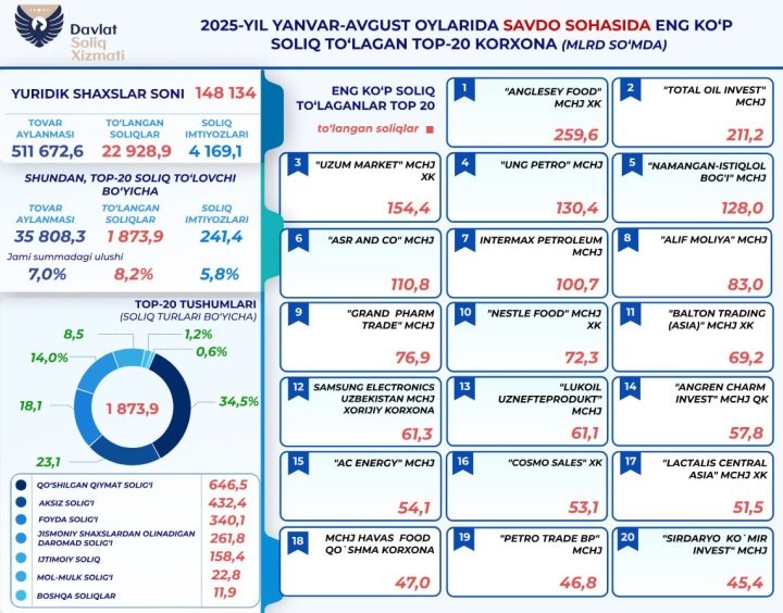 Согласно предоставленным данным, 20 крупнейших предприятий отрасли обеспечили 1,8 трлн сумов налоговых поступлений, что составляет 8,2% от общего объёма налогов, уплаченных юридическими лицами данной сферы. Совокупный товарооборот этих организаций превысил 35,8 трлн сумов, а сумма предоставленных им налоговых льгот составила 241,4 млрд сумов.