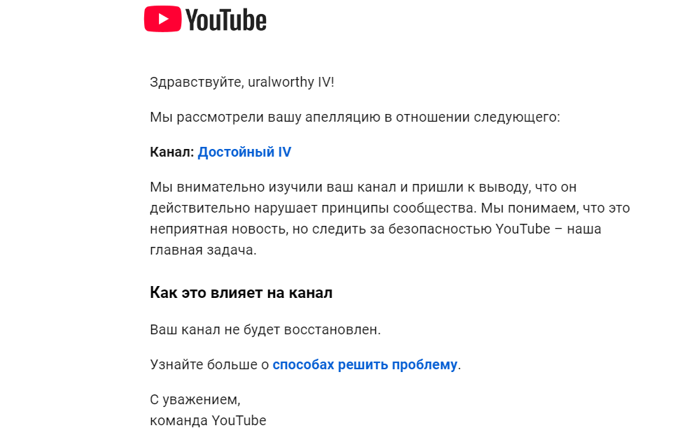Канал Достойный IV удалён youtube, апелляция отклонена