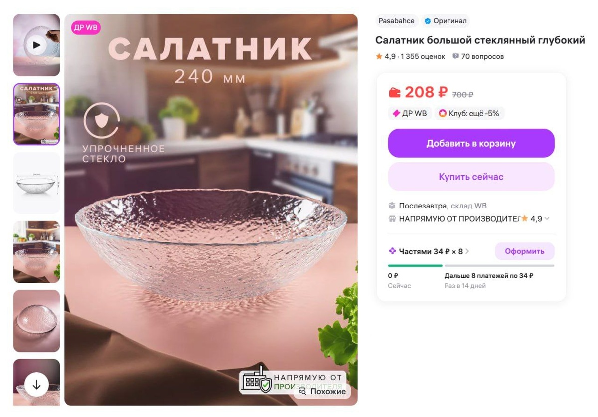 Pasabahce Салатник большой стеклянный глубокий за 208₽