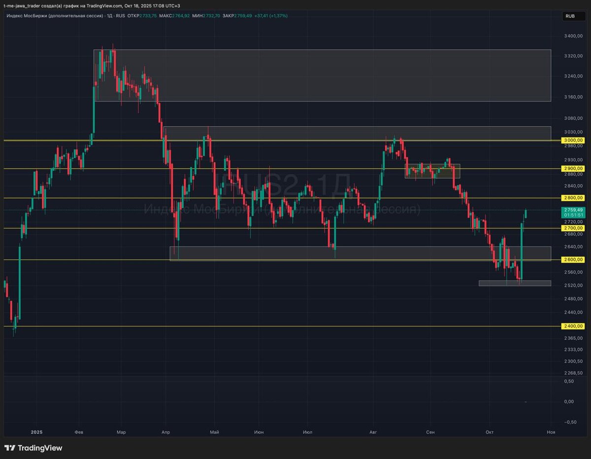 🗓 Итоги недели 13 октября 2025 - 17 октября 2025: Всех приветствую! Завершилась основная торговая неделя. На прошедшей неделе новостные качели продолжились и в четверг начали поступать позитивные новости о телефонном разговоре Путина и Трампа накануне встречи последнего с Зеленским. На этом пошел сильнейший откуп по Индексу Мосбиржи 🇷🇺 $IMOEXF $MXZ5 $MMZ5 🚀🚀🚀 🟢 По итогу закрыли неделю выше важного уровня 2700, что является хорошим знаком и заделом для дальнейшего роста. На сессии выходного дня растем еще выше в сторону 2800. 📉Я считаю, что нисходящий тренд сломлен и сейчас пойдет формирование восходящей тенденции. Следует отметить, что рынок до сих пор остается новостным и могут быть новостные вбросы, которые могут привести к небольшой коррекции в рамках тенденции, однако, сильных проливов не жду, логично сейчас откупать просадку по крайней мере до встречи делегаций России и США на следующей неделе и до заседания ЦБ по процентной ставке. 🏦 Заседание по ключевой ставке На с