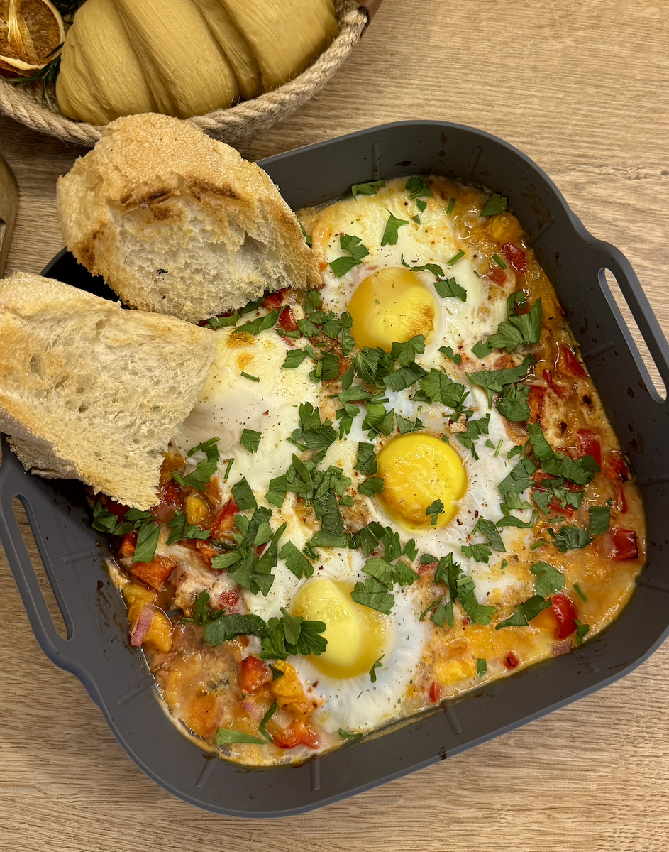 🍞 Чиабатта — для тоста 👩🍳 Рецепт: 1. Помидор и болгарский перец нарежьте кубиком, красный лук — мелко. 2. Выложите нарезанные овощи в форму и запекайте в аэрогриле 6 минут при 180°C. 3. Второй томат обдайте кипятком, снимите кожицу и разомните вилкой. 4. Добавьте к овощам размятый помидор, посолите, поперчите и перемешайте. 5. Вбейте 4 яйца. 6. Запекайте ещё 8–10 минут при 180°C, пока белки не схватятся, а желтки останутся мягкими. 7. Посыпьте прованскими травами и свежей петрушкой. 8. Подавайте с ломтиками хрустящей чиабатты — чтобы макать в соус 😋 Приятного аппетита! 💛 #рек #рекомендации #завтрак #ужин #рецепт #идеядлязавтрака #фудблог #шакшука #аэрогриль