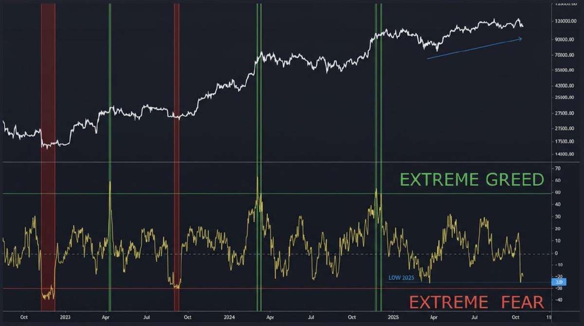 Открытый интерес во фьючерсах на Bitcoin показывает минимум за 2025 год, близко к зоне крайнего страха