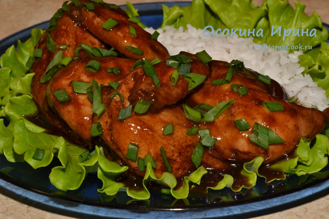 У двух цыплят-корнишонов (около 500-600 г каждый) вырезала позвоночники, разрезала вдоль пополам, обрезала крайние фаланги крыльев и обрубила суставчики на ножках. В миске смешала 1/2 стакана соевого соуса, 1/4 стакана коричневого сахара, 1/3 стакана "Мирина" и влила 1 стакан воды, добавила 4 измельчённых зубчика чеснока и 1 ст.л. измельчённого имбиря и промешала хорошенько до растворения сахара, вылила смесь в сотейник, уложила подготовленных цыплят, довела до кипения, накрыла кастрюлю крышкой и тушила всё на минимальном огне в течение 40 минут, один раз перевернув цыплят, после чего достала их, а бульон уварила вполовину в течение 15 минут, добавила в него 1 ст.л. с верхом кукурузного крахмала, разведённого в 3 ст.л. воды, промешала до загустения, вернула цыплят, прогрела, обваляла в соусе и подала с рисом, густо поливая вкуснейшим соусом и посыпая резаным зелёным луком. Бесподобная вкуснятина получилась) Приятного аппетита