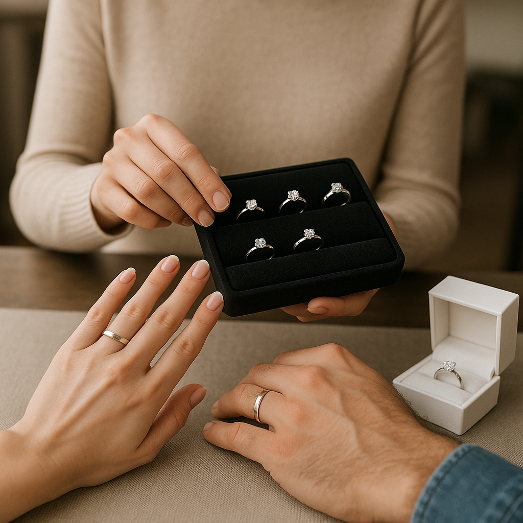 2. Примеряйте вместе: Обручальные кольца должны нравиться обоим. Обязательно примеряйте их вместе и почувствуйте, насколько они удобны.
